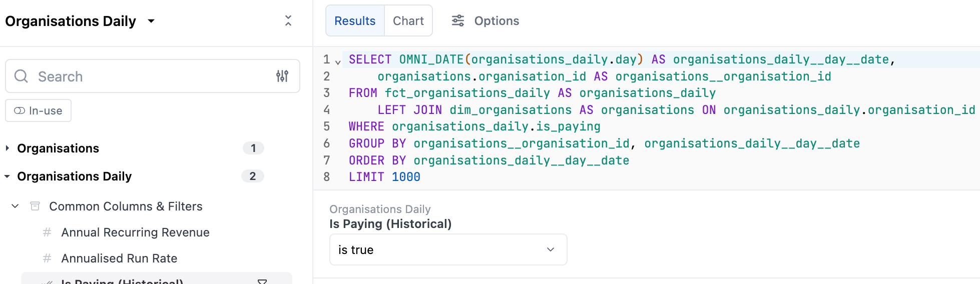 Using our BI tool Omni, we can surface pre-joined datasets like dim_organizations and fct_organizations_daily with default filters applied.