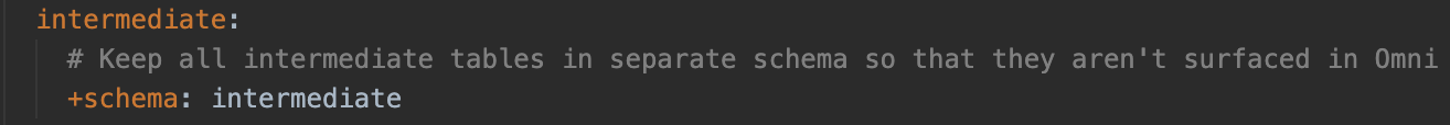 In our dbt_project.yml file, we simply put the intermediate models in another schema altogether.