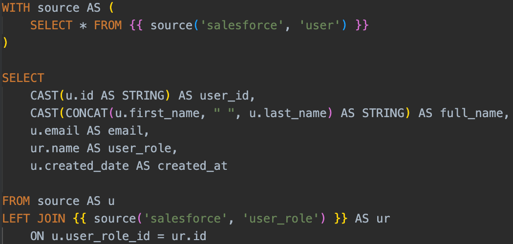 In some cases, data sources can have a highly denormalized table structure (like Stripe or Salesforce), and we might have multiple source tables that are only ever used in conjunction with others. Take the Salesforce user and user_role tables for example in our stg_salesforce__users table: