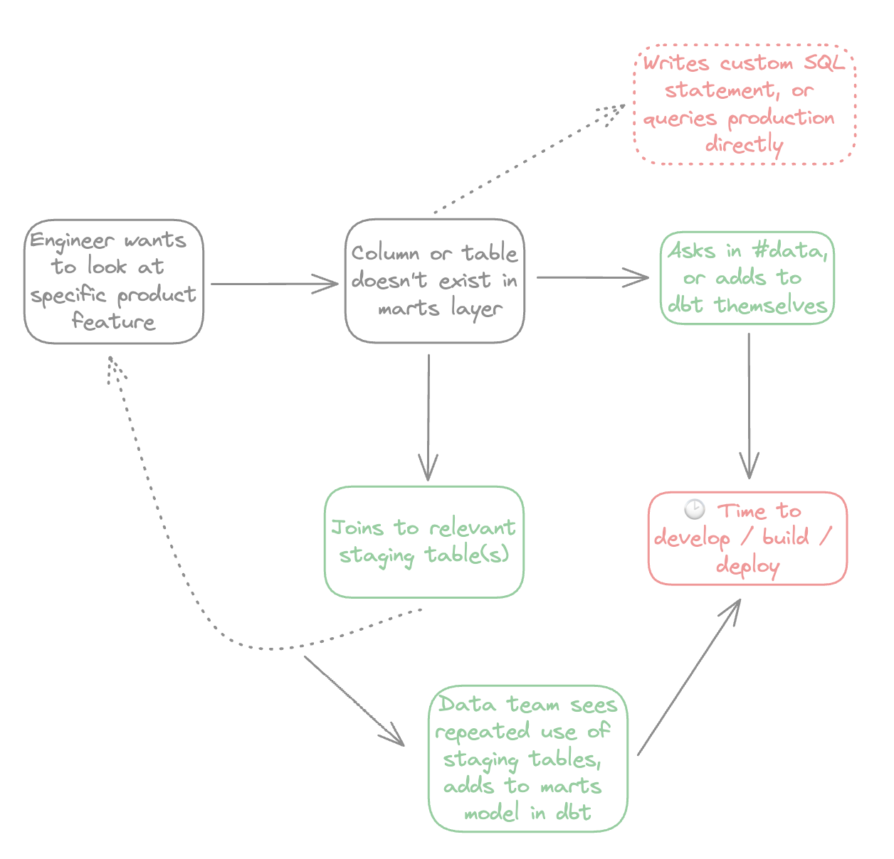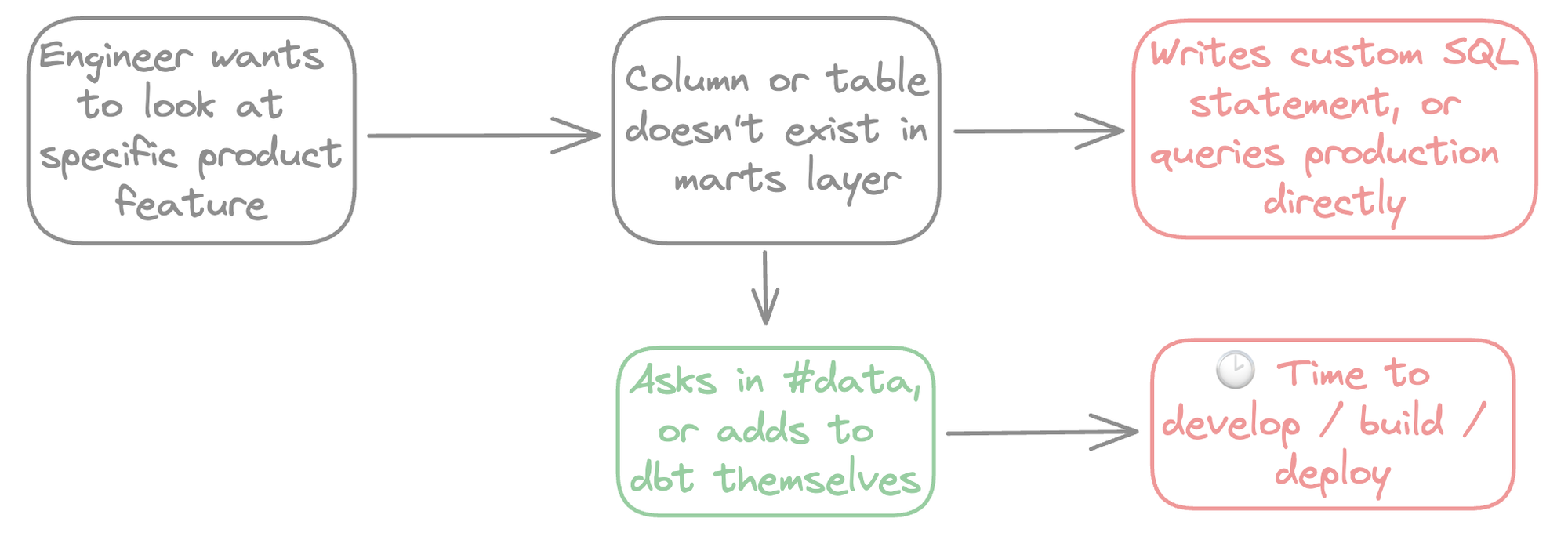 Typically, in BI tools, you’d only surface marts models like a dim_users table. But say an engineer wants to look at how a specific product feature is being used - and they are missing a column (or entire data model!) needed to answer their question.