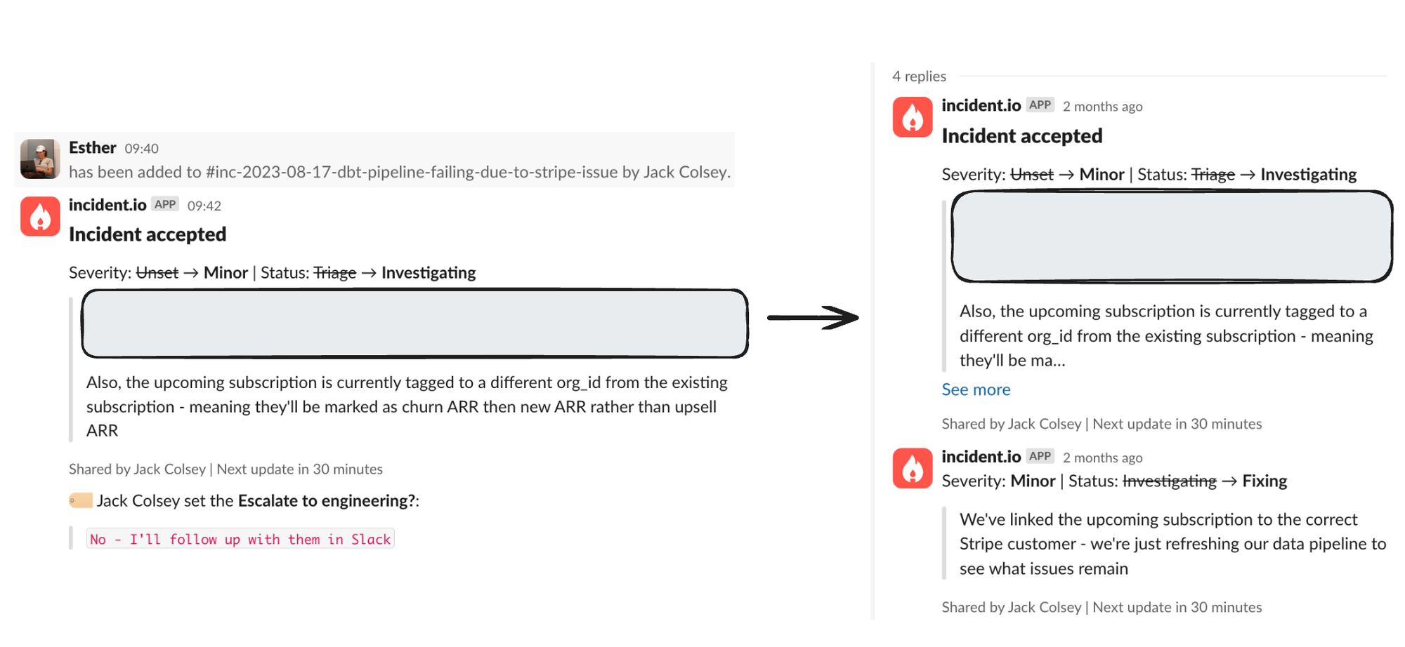 Updates created in the channel are automatically threaded against the original Slack message where the channel was created, and sync with our web app
