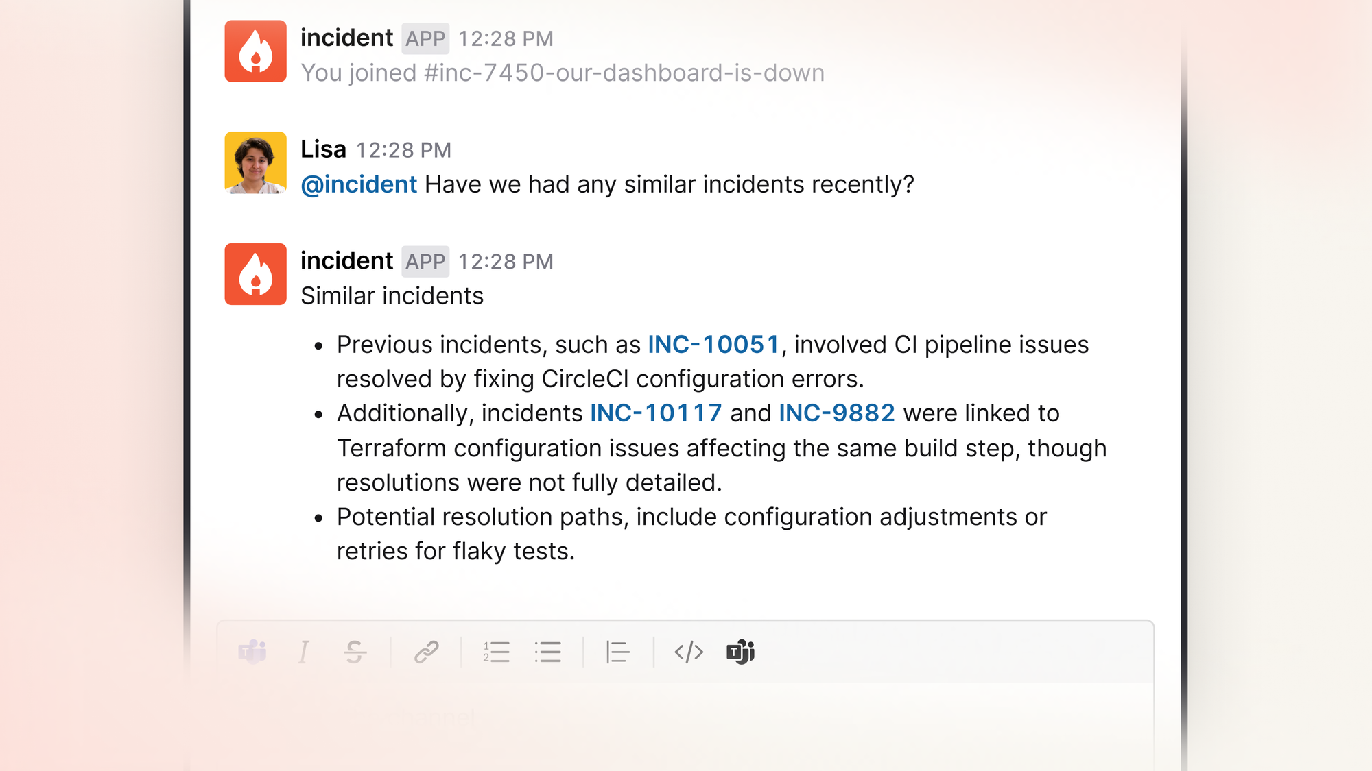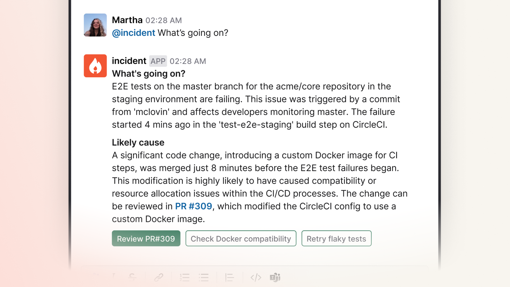 Imagine an on-call engineer is paged at 2am: instead of scrambling to identify the problem, incident.io quickly flags, “This is the bad change. You might want to revert that change”. We can instantly identify similar past incidents and review relevant code changes and diagnostic dashboards, putting vital context to your alert at your fingertips before you even open your laptop.