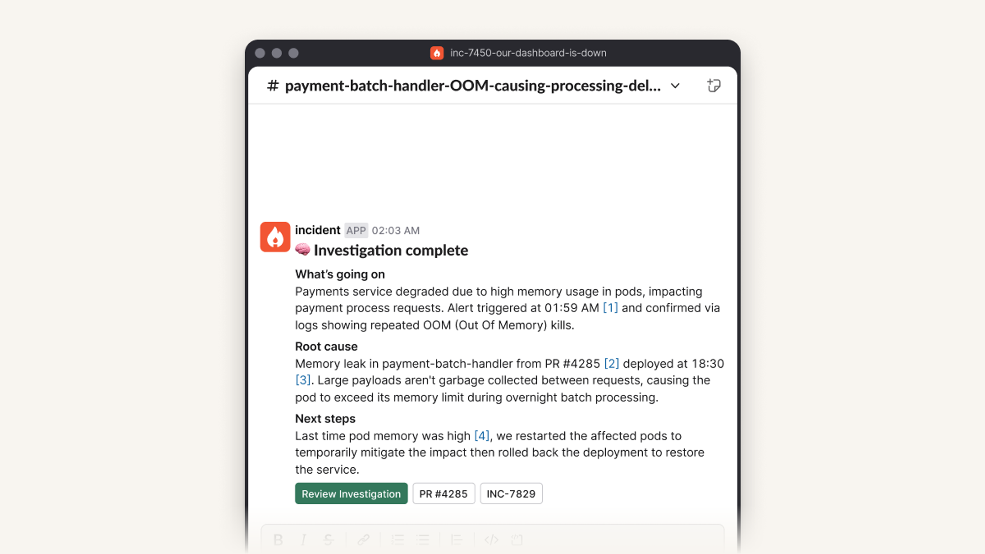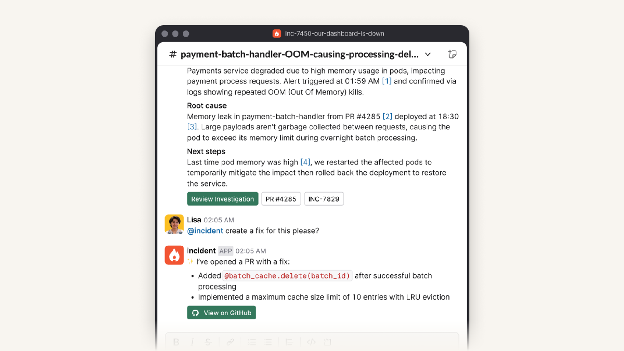 All of this happens without leaving Slack & Microsoft Teams. AI SRE catches relevant context from across channels, searches dashboards and logs from Grafana or Datadog, and can even fix bugs directly by generating pull requests. No tab switching, no context switching.