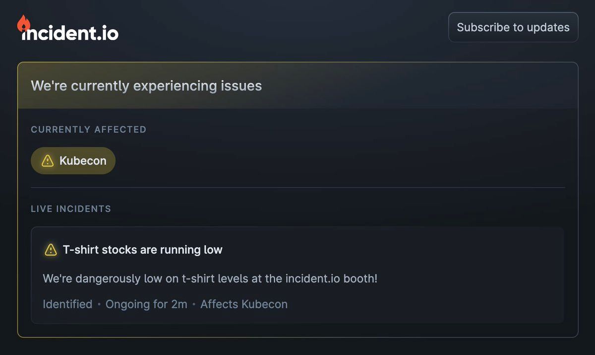 Going into Day 1 of KubeCon, our team joked about how funny, albeit unlikely, it would be if we ran out of swag. We even tweeted about it, and tested our Status Page with an incident, which was probably a sign of things to come.