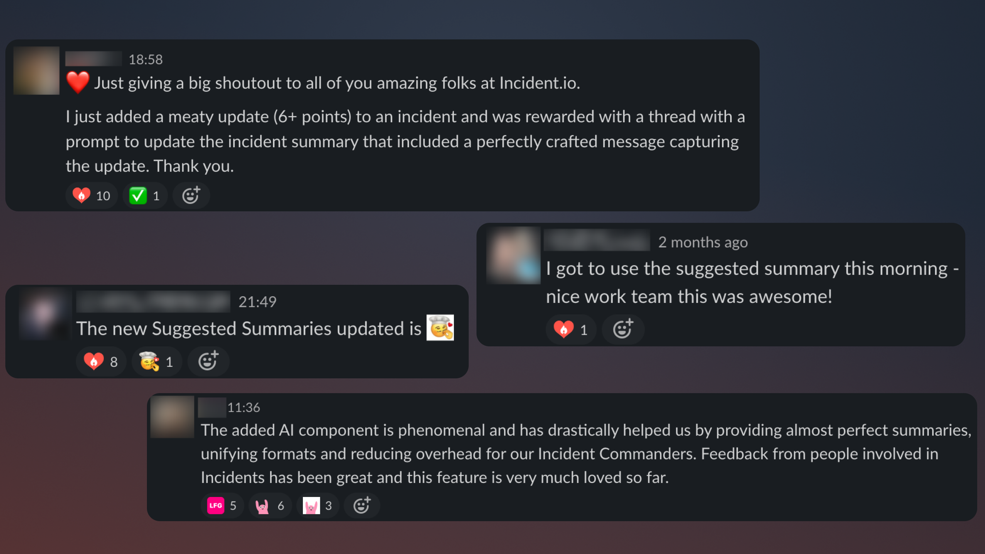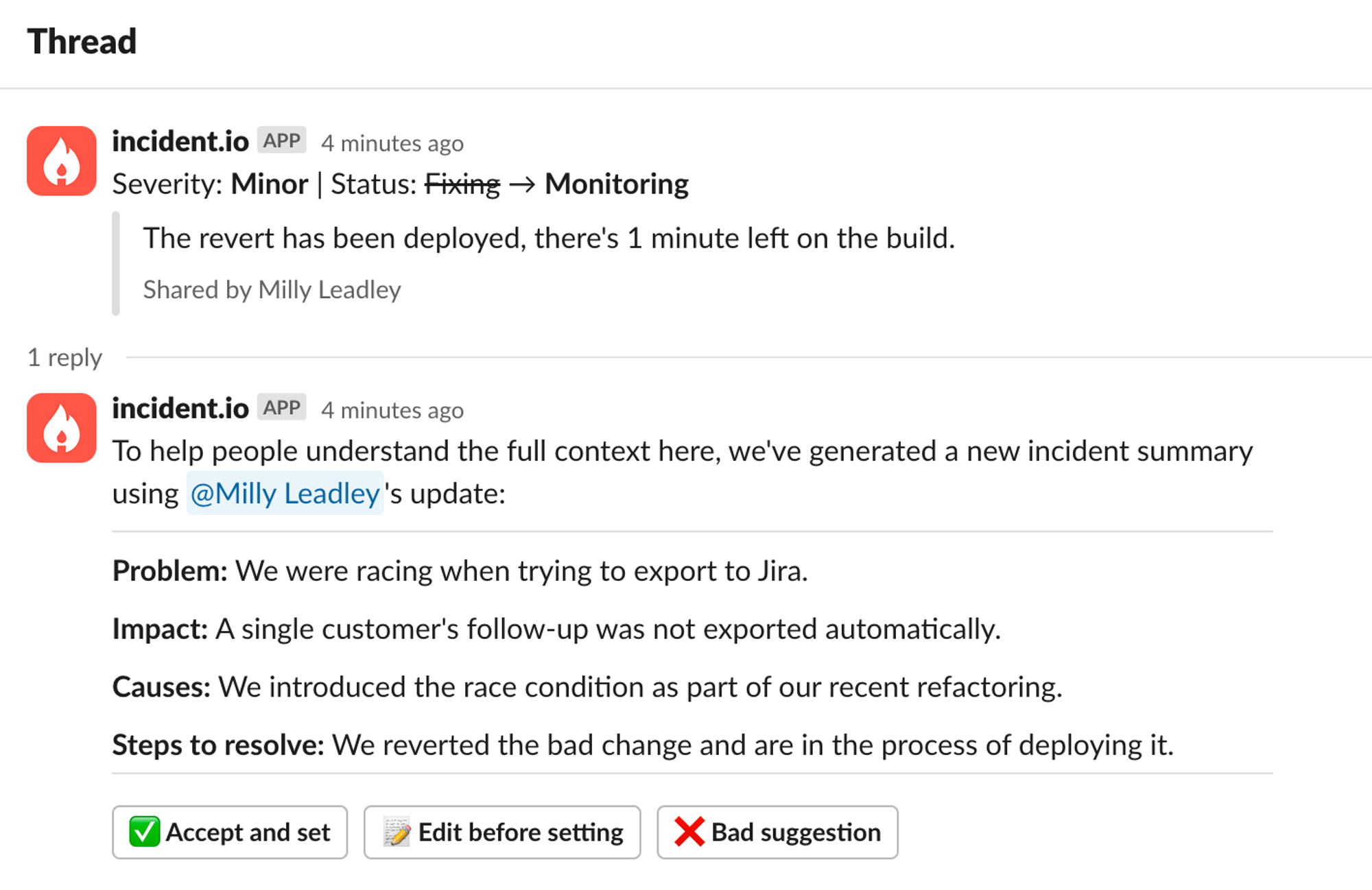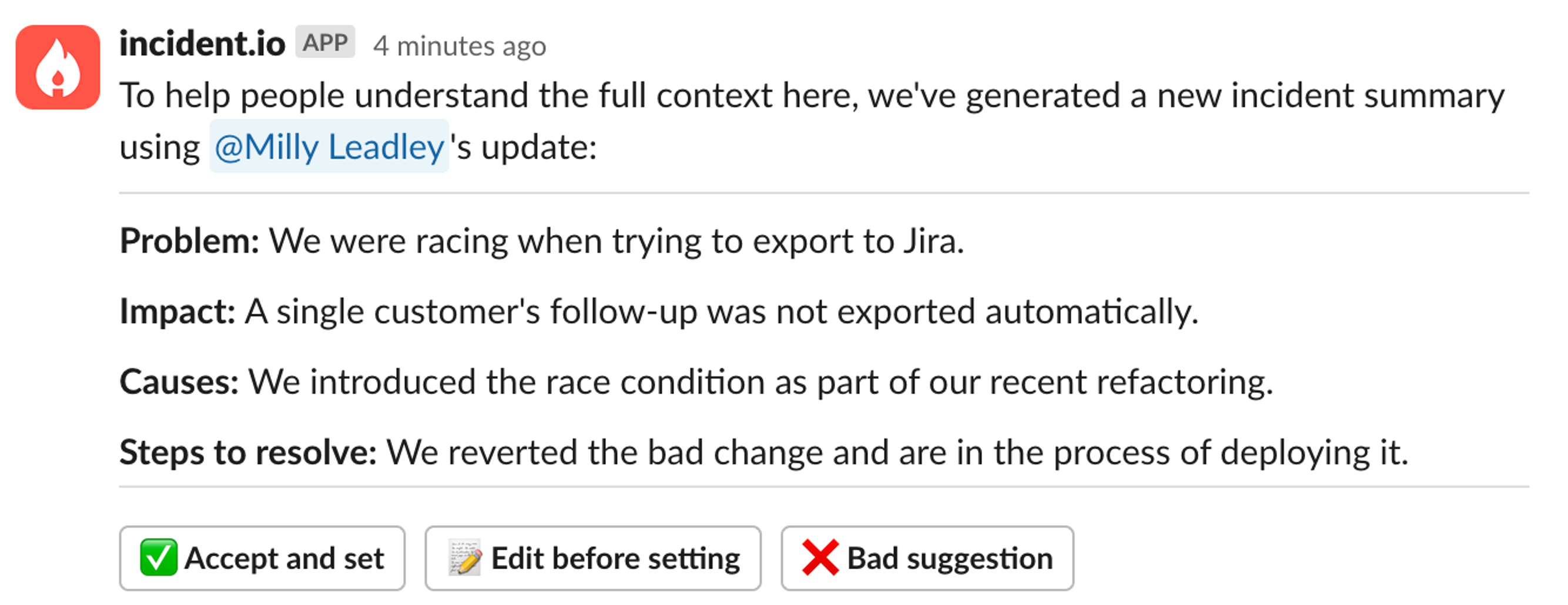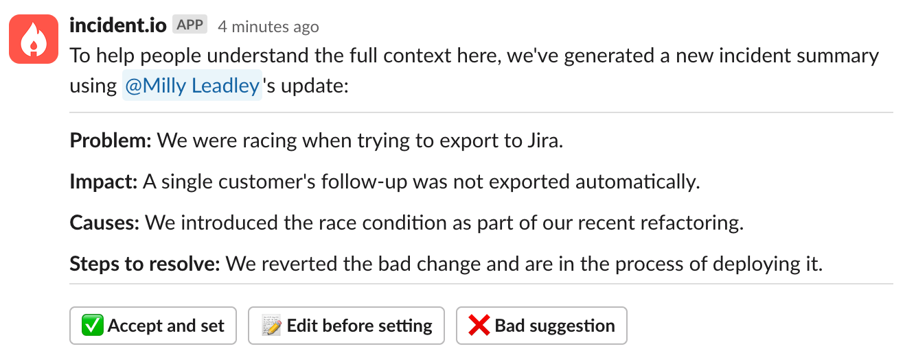 This suggestion will consider your update, the conversation in the channel, and the previous summary (if there was one). You can choose to accept it as-is or apply some tweaks first. This gives people the benefit of an up-to-date incident summary with loads of time saved. We launched it to all our customers in November, and the reaction was better than we could have hoped for.