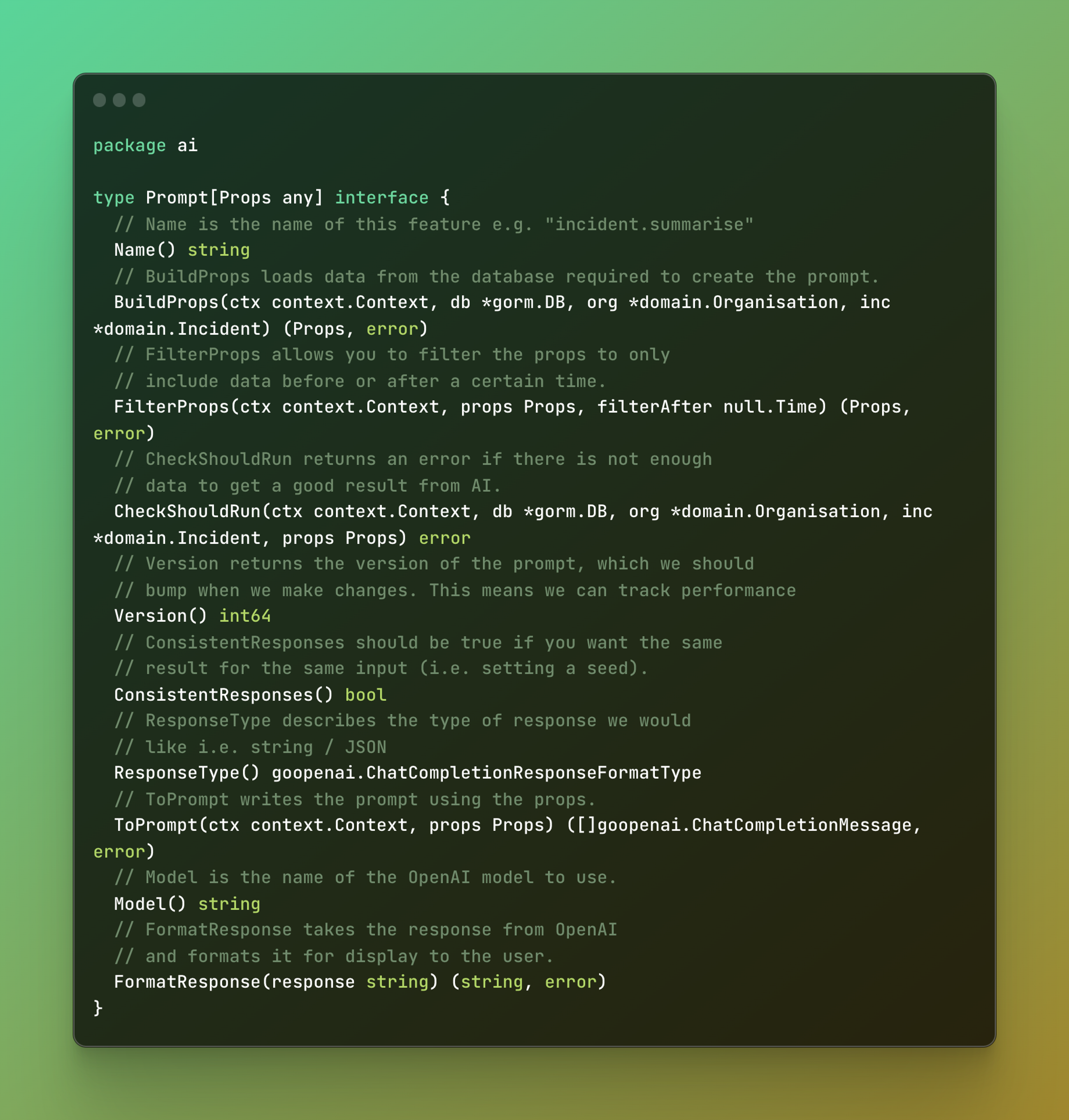 This means that when building a new AI feature you just need to fill out the interface and call RunPrompt. The caller does not need to concern itself with any of the admin aspects of using OpenAI.