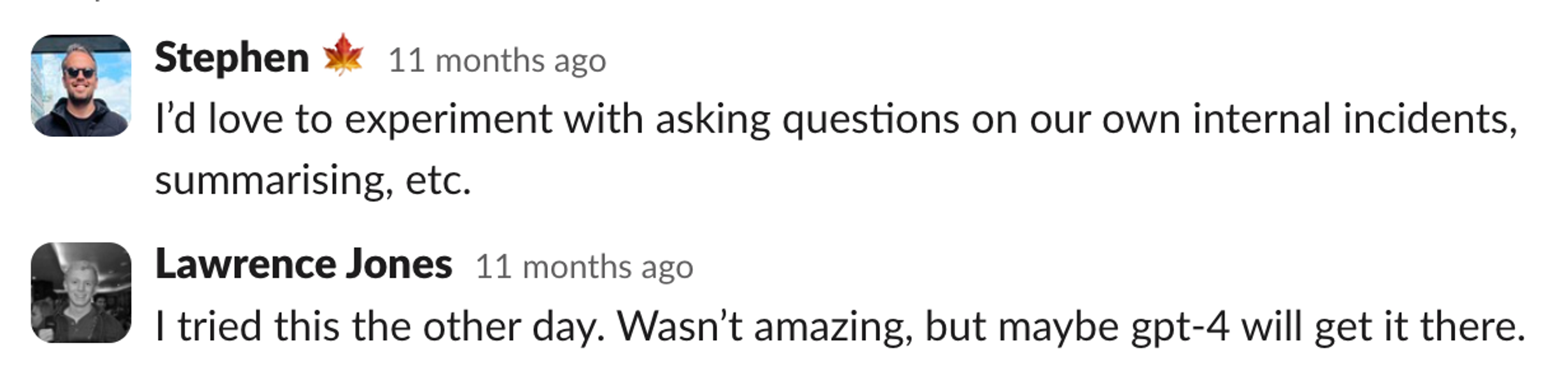 This might not be relevant if you’re using a GPT model which doesn’t return free text, but one thing we struggled with was getting GPT to extract the key facts that people coming to the incident would care about, rather than just a couple of paragraphs about “what’s happened so far”.