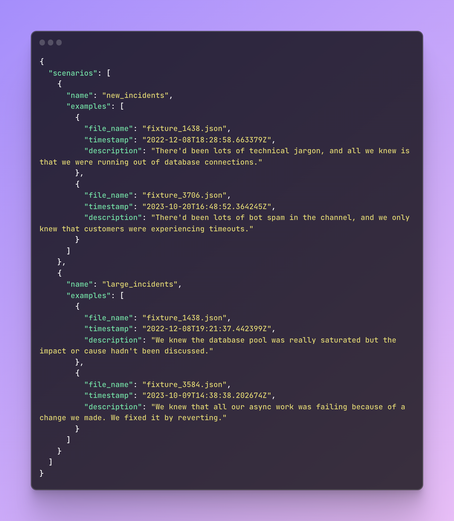 Note that the timestamp is the point in time we want to test generating a summary for that incident, which means that any data in the fixture file that came after this timestamp will be filtered out.