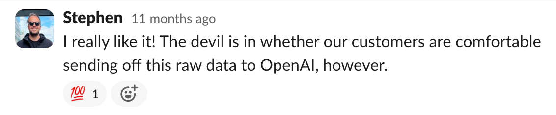 Aside from legal requirements you’ll also want to consider data requirements. Do you have easy access to all the data you want GPT to evaluate? For us, we had a question mark next to Slack messages. We usually enrich these on the fly by calling the Slack API (to avoid concerns about storing customer data), and we were worried that enriching hundreds of messages in a channel would take too long. This turned out to be fine because there’s a helpful endpoint for enriching the whole conversation. But if you need to start storing new pieces of data for your use case, you’ll have to consider how you store that data and whether or not you need to notify your customers.