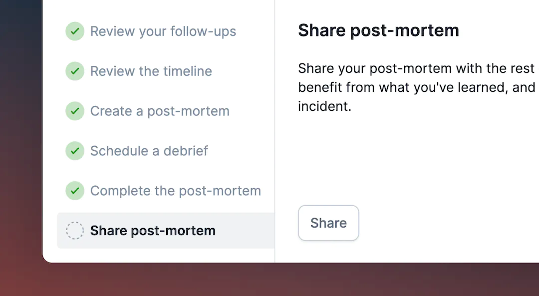 This features makes it easy for folks across teams to learn from incidents and helps foster a culture of continuous improvement.