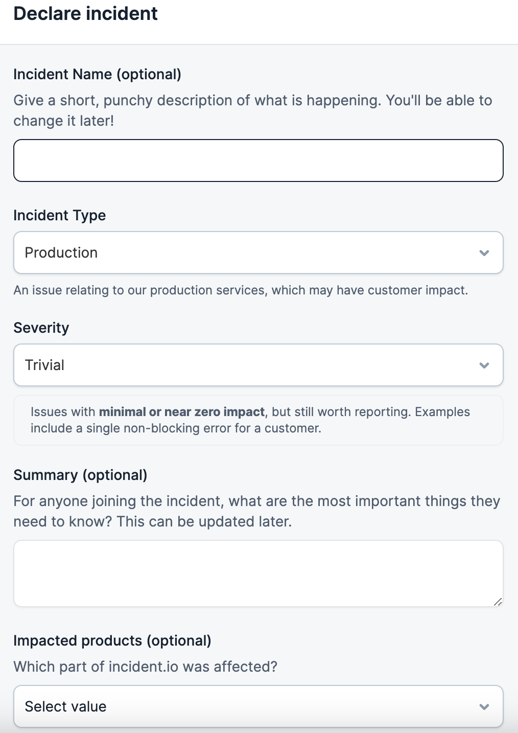 What you’re seeing above is our actual incident declaration form. All folks need to do is fill out the incident name (this can be anything), type (what the issue is affecting), severity (we include a handy note that explains what to consider when deciding severity) and a summary field.