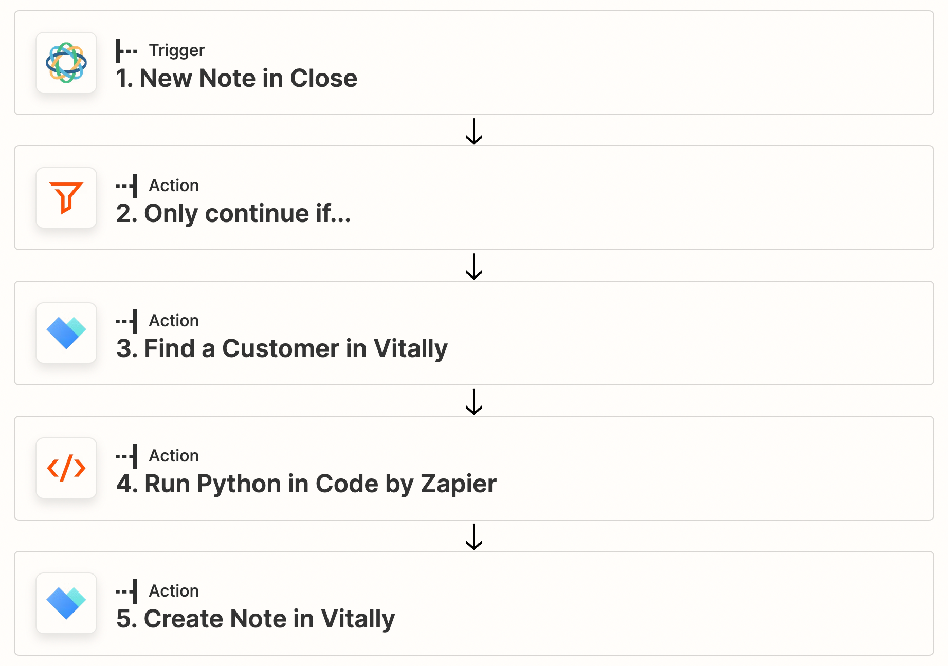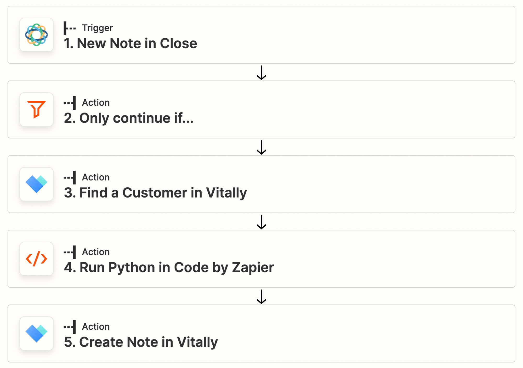 You guessed it, Zapier is the right tool for the job when connecting these teams. Whenever our Sales team create customer notes in Close, we also sync them with Vitally. In the same way, Vitally notes get sent to Close! By synchronising notes, both teams can continue to use the systems they’re comfortable with but with a shared understanding.