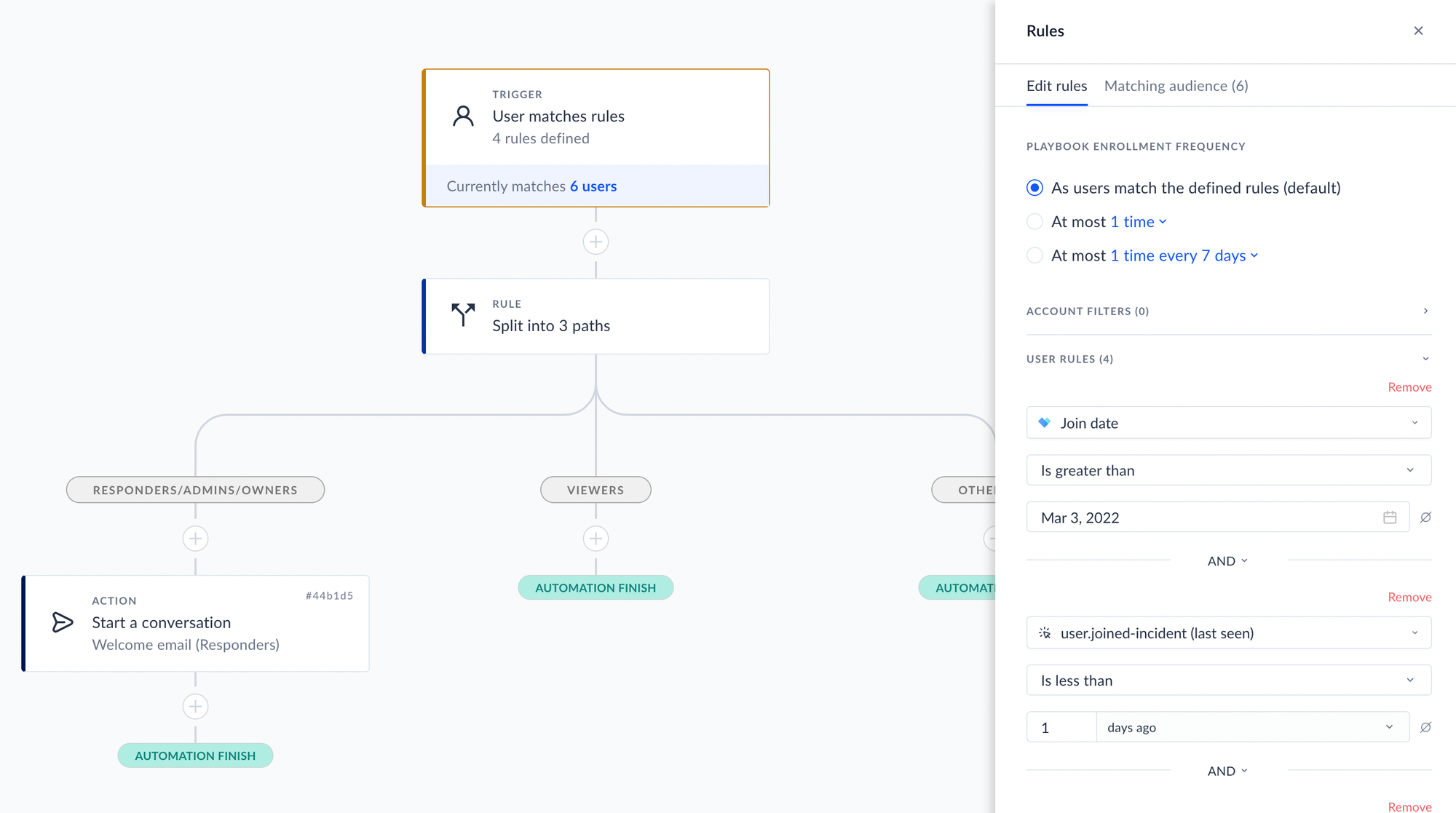 In addition to the relationship management aspects of Vitally, Playbooks can be used to cohort users and trigger conversations at various parts of the user journey. An example is to email users within one day of their first incident, asking how it went and if there were anything they’d like to have see.