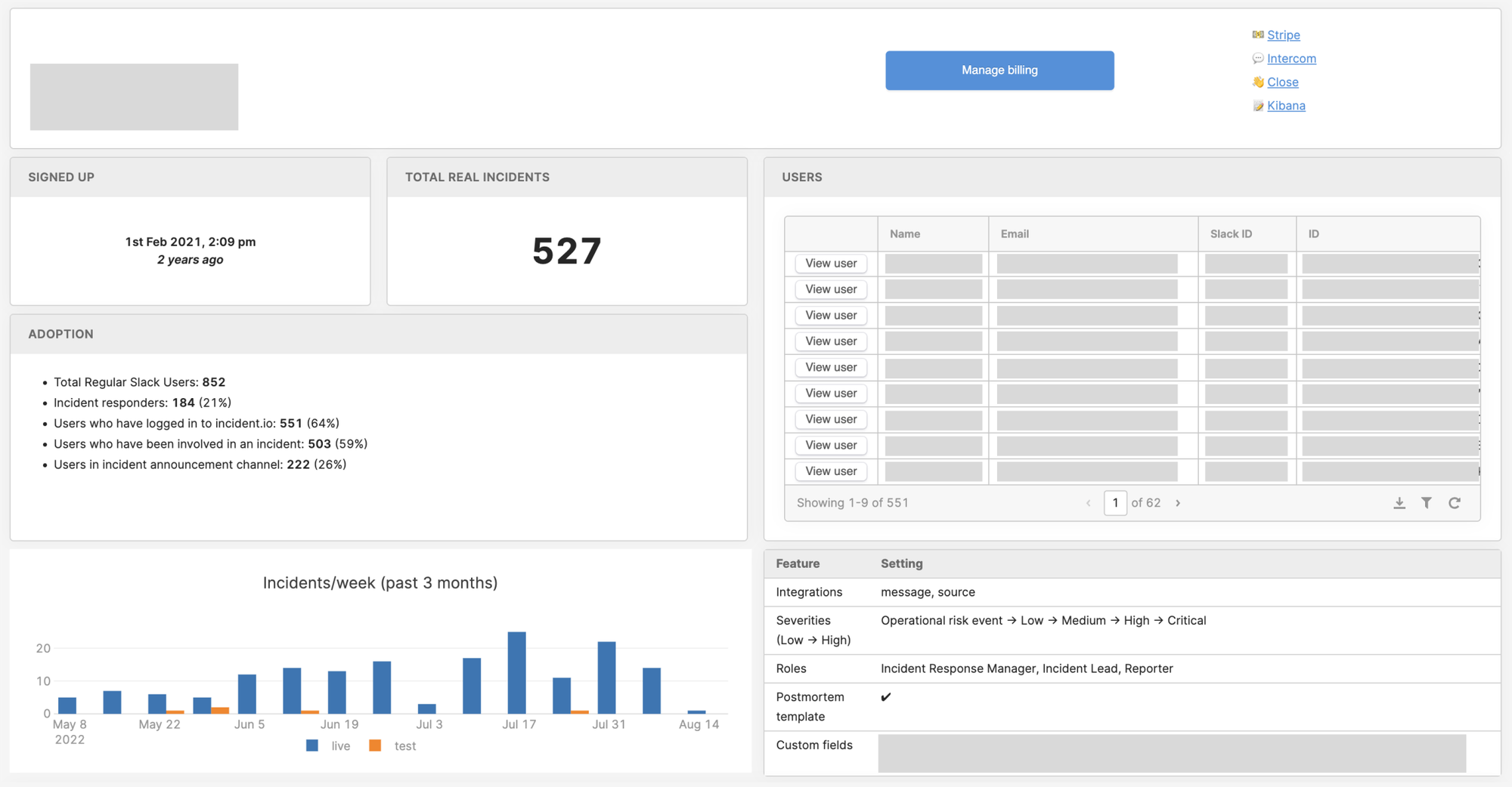 When a Stripe subscription is created, the incident.io application gets a message and activates a fully featured version of the application. At this point, Customer Success takes over to ensure we retain the customer for years to come!