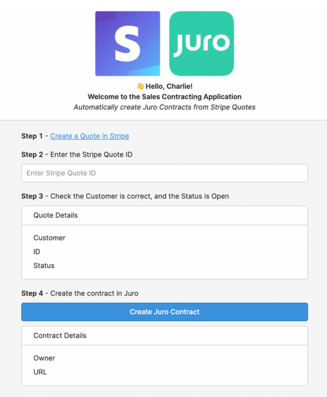 When our Sales team want to move even faster, we built an application in Retool to automatically create contracts in Juro when provided with a Stripe quote. This application grabs information like the customer name, address, and email from a Stripe quote, along with all the agreed-upon quote terms, and populates the contract with the required information. It also embeds a hidden field on the contract that links back to the quote which it was created from - full traceability!