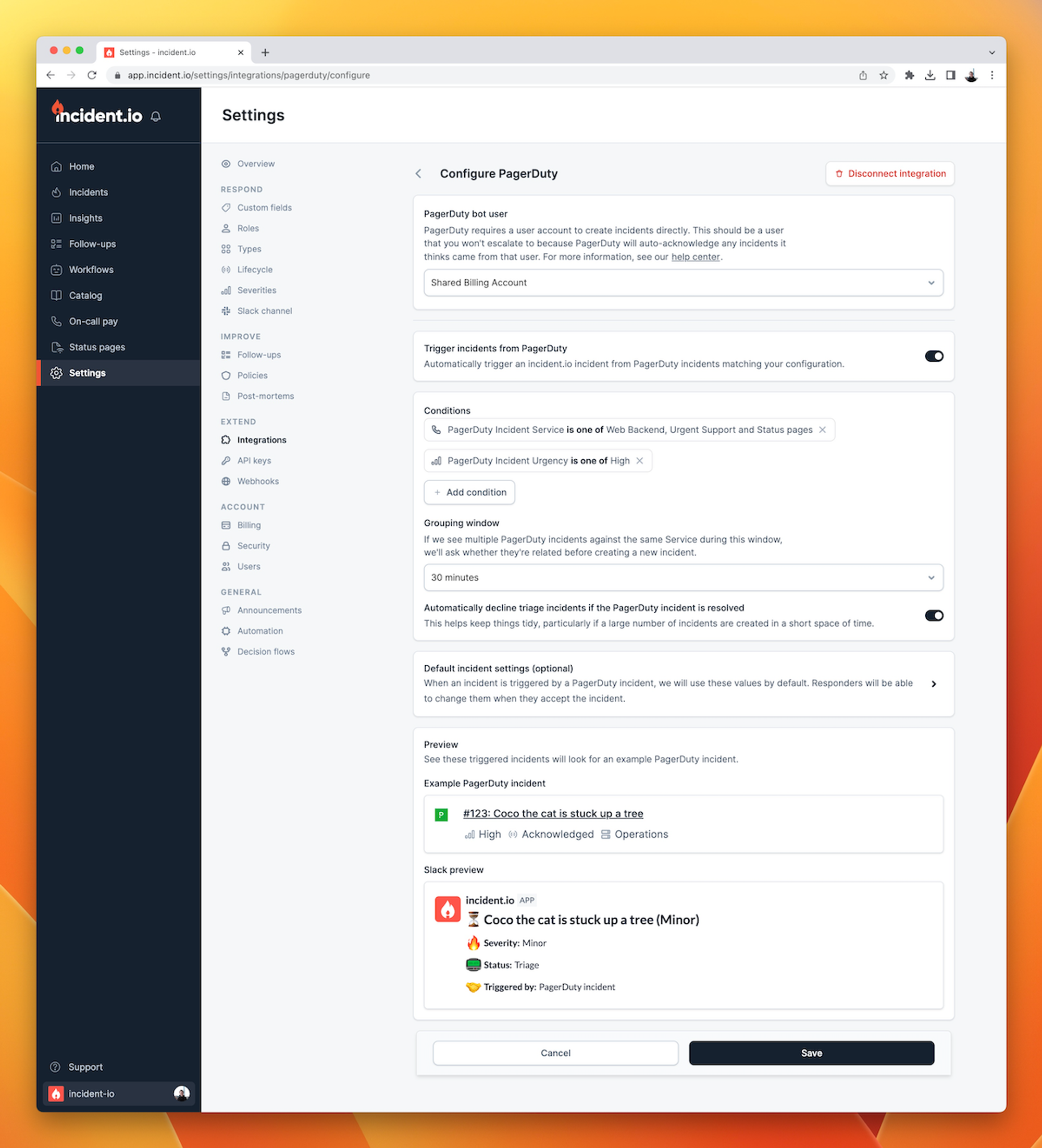 With the incident triggers feature, you get a configurable debounce window per service. So if the same service fails twice within 30 minutes, you’ll only get one incident (and the option to attach non-initial alerts to the incident). This means you can focus on your targeted incident channel and ignore the noise coming from PagerDuty.