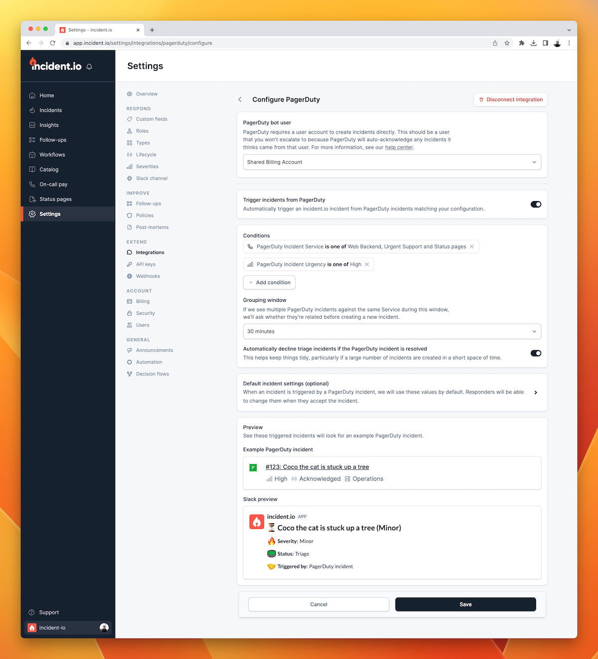 The core part of this flow is our incident triggers feature. Enabling this feature means that anytime a PagerDuty alert triggers, incident.io creates an incident in a triage state. Triage state is a precursor to a full incident.