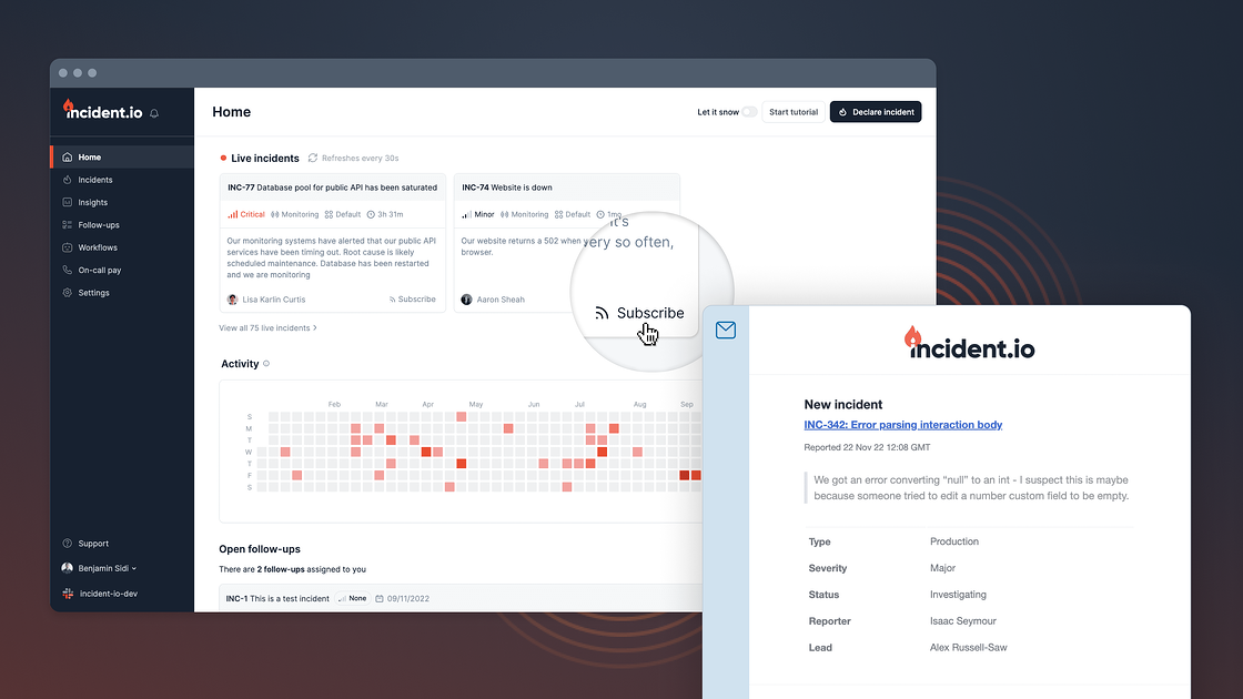 We knew that this was an issue so we came up with a resolution. Now, thanks to our Subscriptions feature, you can get alerts for incidents you care about most via Slack DM, to your inbox, or via an SMS.