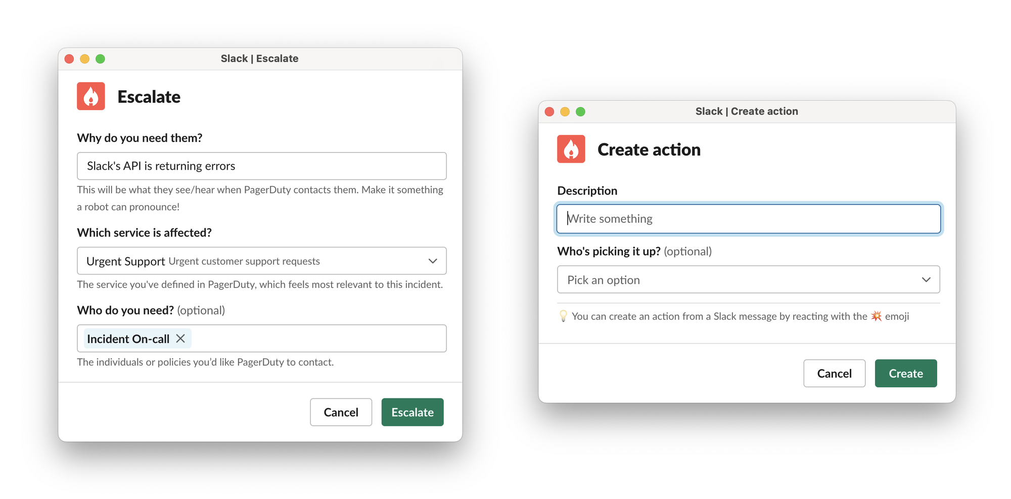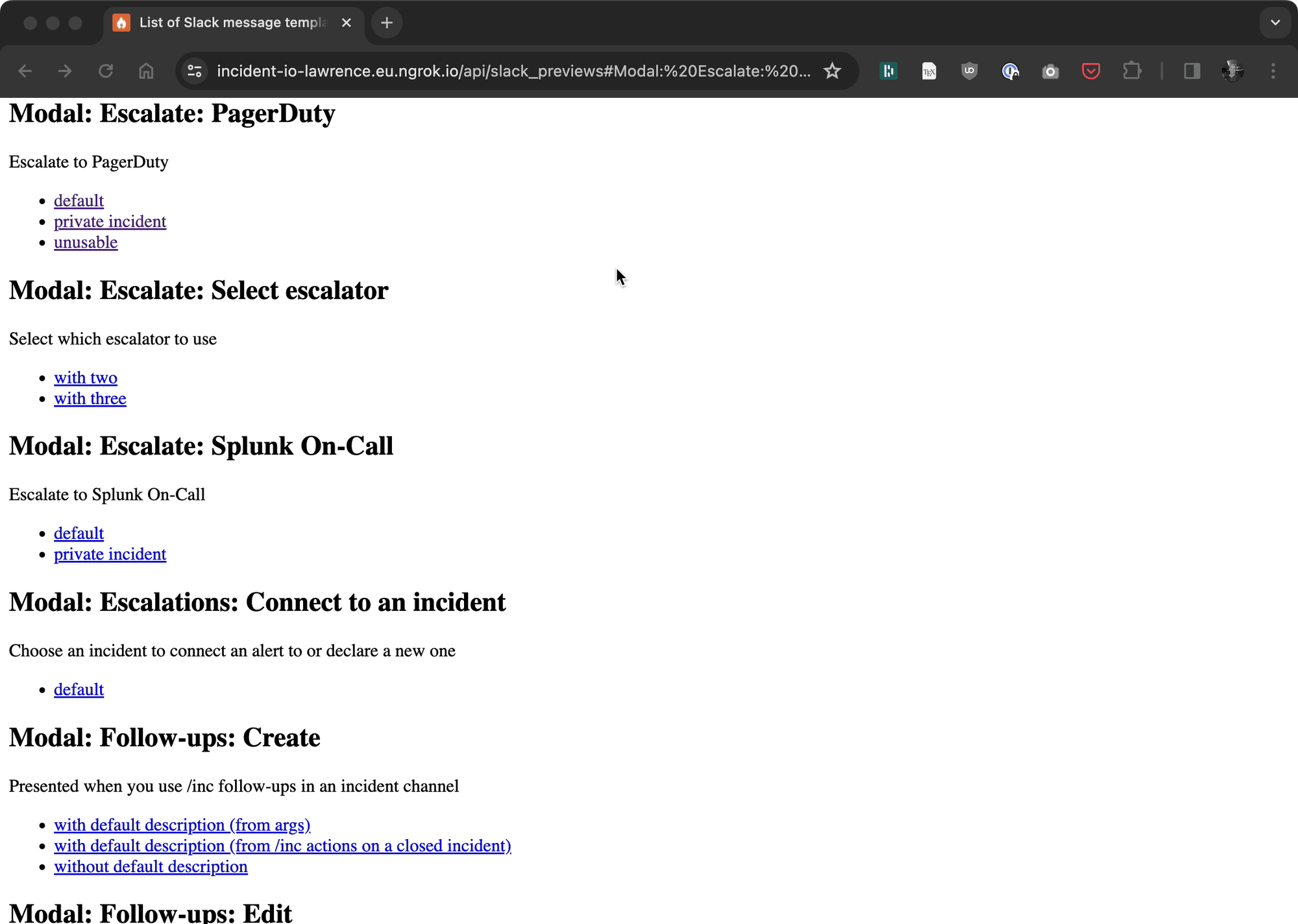 })This will activate the escalate modal and build three ‘Slack previews’ for it: one for a normal incident, one for a private incident (we need to warn people before they page people about something sensitive!) and another for when the account doesn’t have a usable PagerDuty connection.