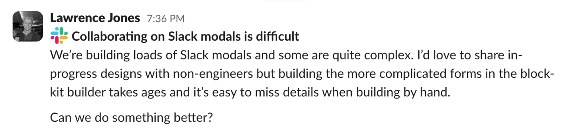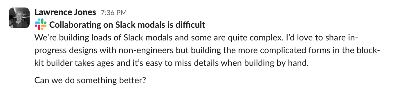Block Kit Builder is awesome but our app is growing pretty big. In fact, we have over 70 different Slack modals (forms) and almost as many messages now, which is really quite a lot to keep track of.
