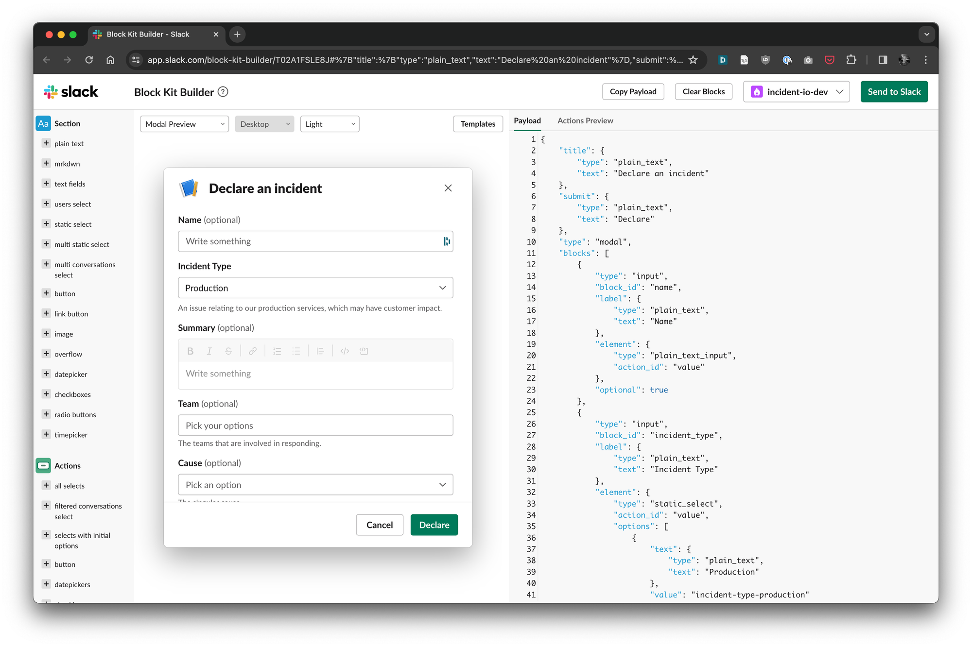 Slack have a great tool called the “Block Kit Builder” that provides a wysiwyg editor where you can build forms or messages then share a link so others can see your work. It’s great for getting design feedback – see below for an example of our “declare an incident modal”.