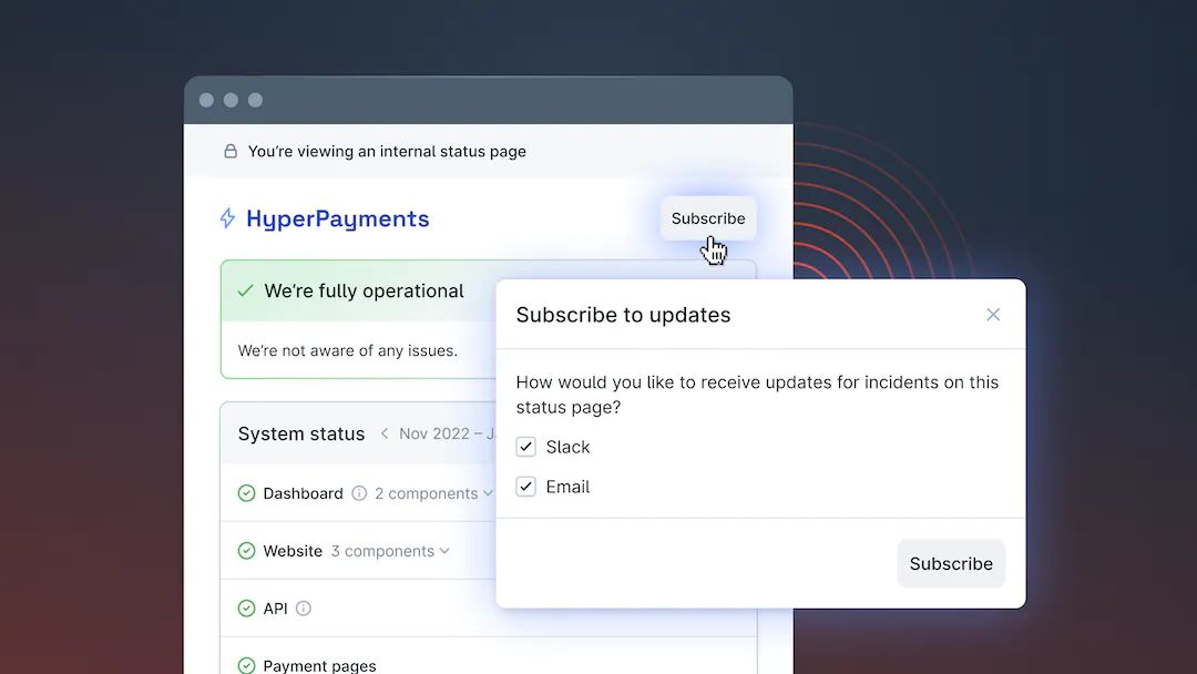 It’s important for customers to be able to pick and choose how they want to receive notifications from your Status Pages. So in addition to email and RSS feeds, we’ve made it easy for users to subscribe to notifications via Slack. Incidents are managed in Slack, customers live in Slack for day-to-day notifications, so we made it easy for them to receive status page notifications where they work — in Slack.
