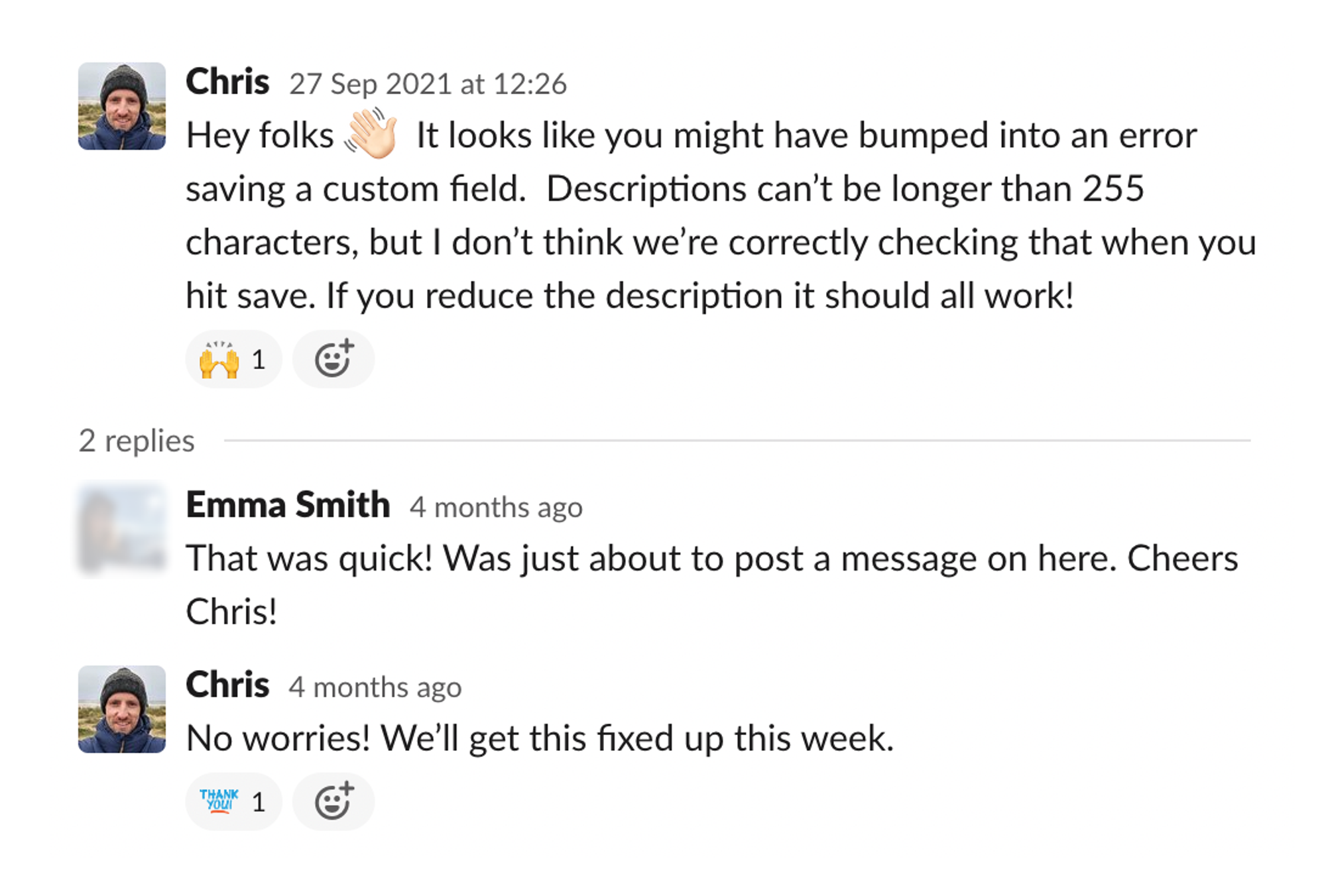 In our experience, a swiftly fixed bug that’s communicated with a customer works wonders for building trust.