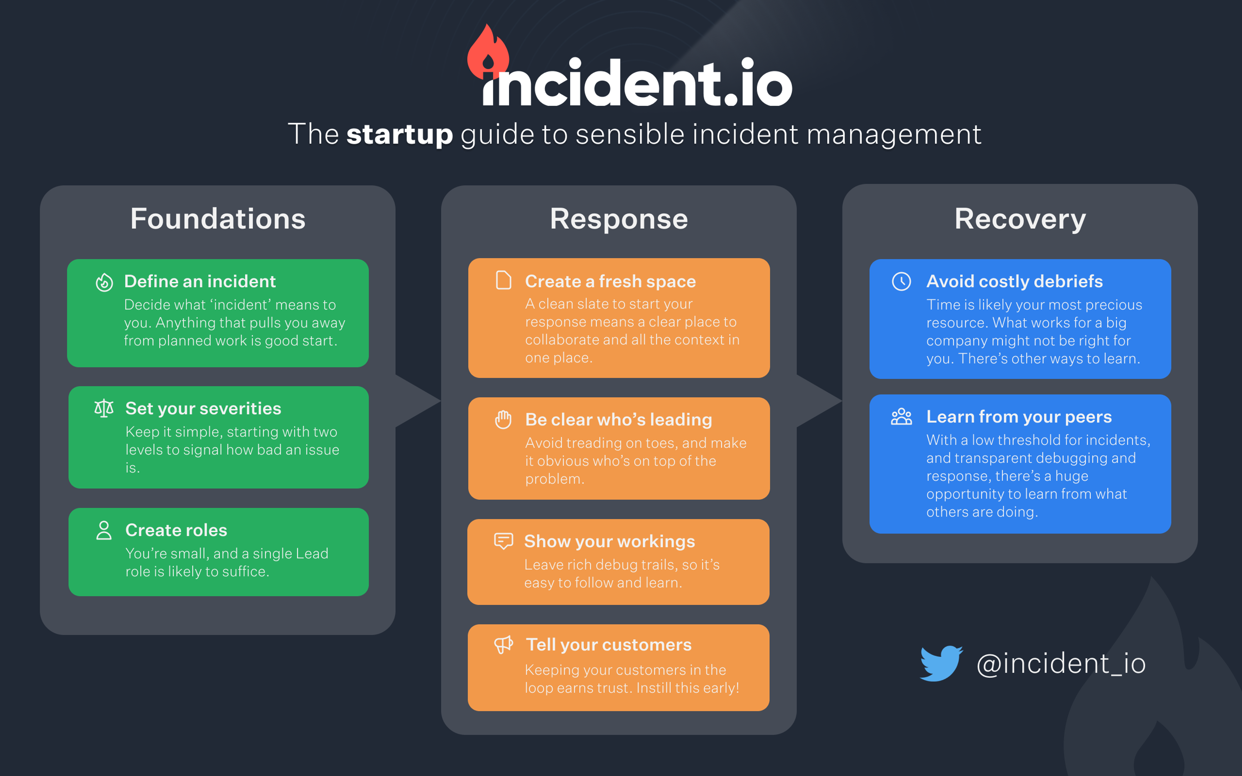 Early-days incident management is as much about what you shouldn't do as what you should, and – strictly between us – this guide is basically how we’re doing incidents at incident.io right now. Think of it as a set of sensible defaults that can be easily adopted to get you off to a great start.