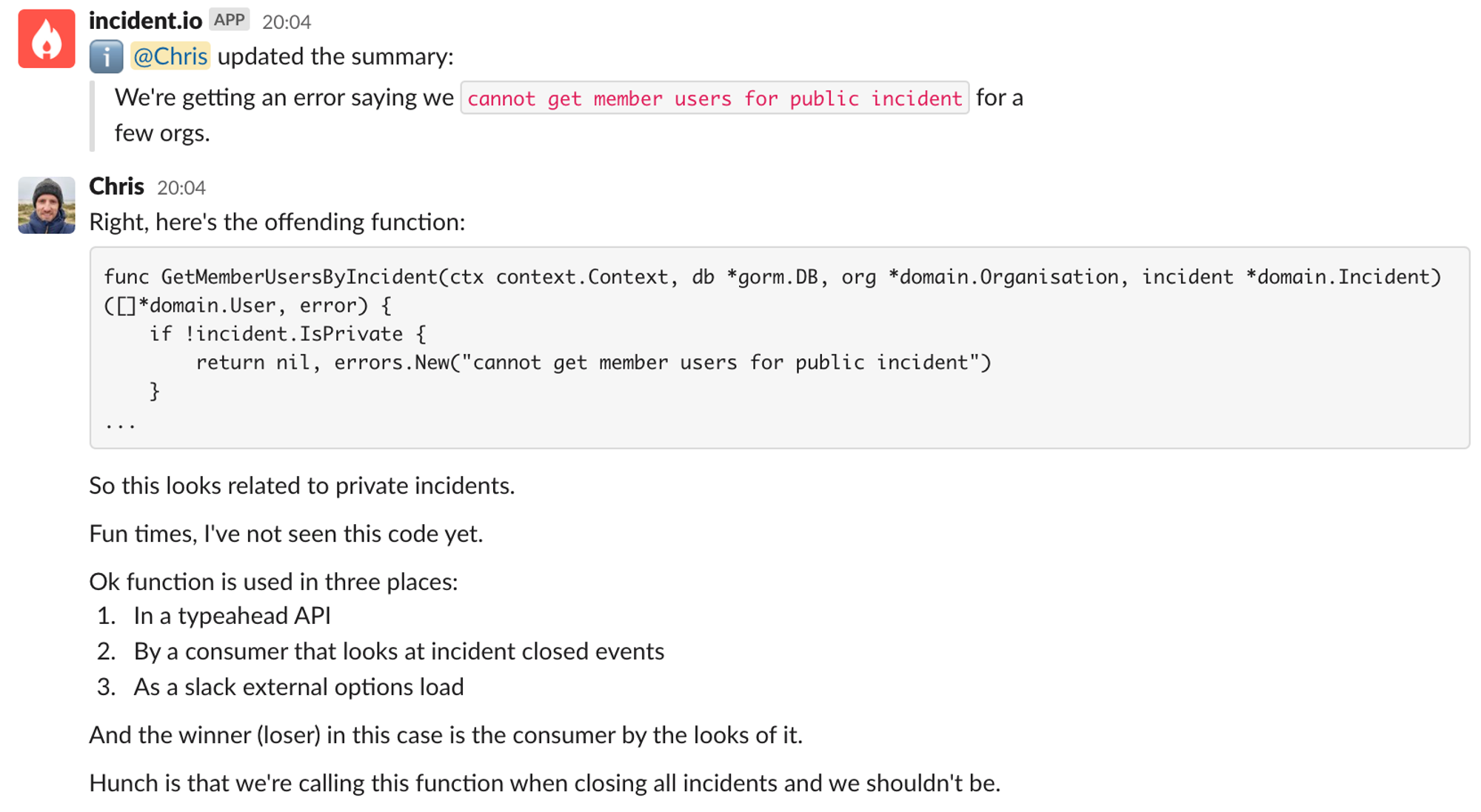 At incident.io we treat any interruption to normal work as an incident. That might mean a single Sentry error that needs investigation, some behaviour we can’t explain, or a report from a customer. Our motivations for doing so are: