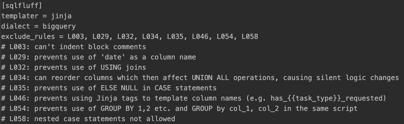 We use this in conjunction with a version controlled .sqlfluff file that lets you configure sqlfluff rules and ignore rules you don’t like: