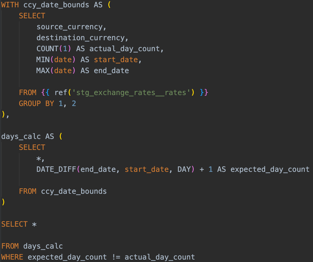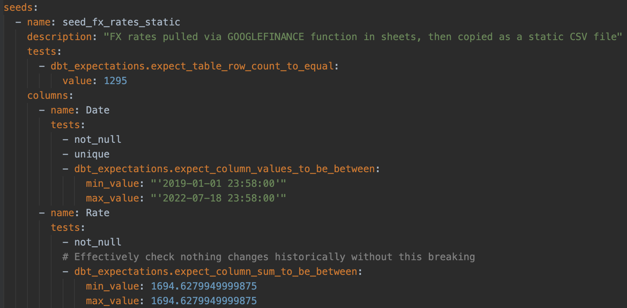 GOOGLEFINANCE and version control them in a CSV file, then load these into BigQuery using a dbt seed. A benefit here was being able to easily write tests to make sure this data never changed in terms of row count or values