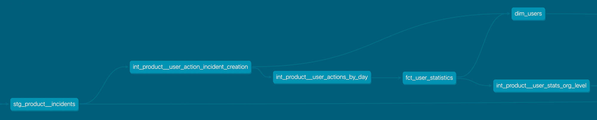 dim_users on a timestamp level (e.g. first_incident_created_at)int_product__user_actions_by_day at a daily level (e.g. number_incidents_created)Given our pattern of enforcing fct_user_statistics to run before dim_users, so that the latter can pull the latest row’s worth of statistics data (e.g. number_incidents_created_to_date), if we didn’t have this intermediate table then in dim_users we’d have to either: