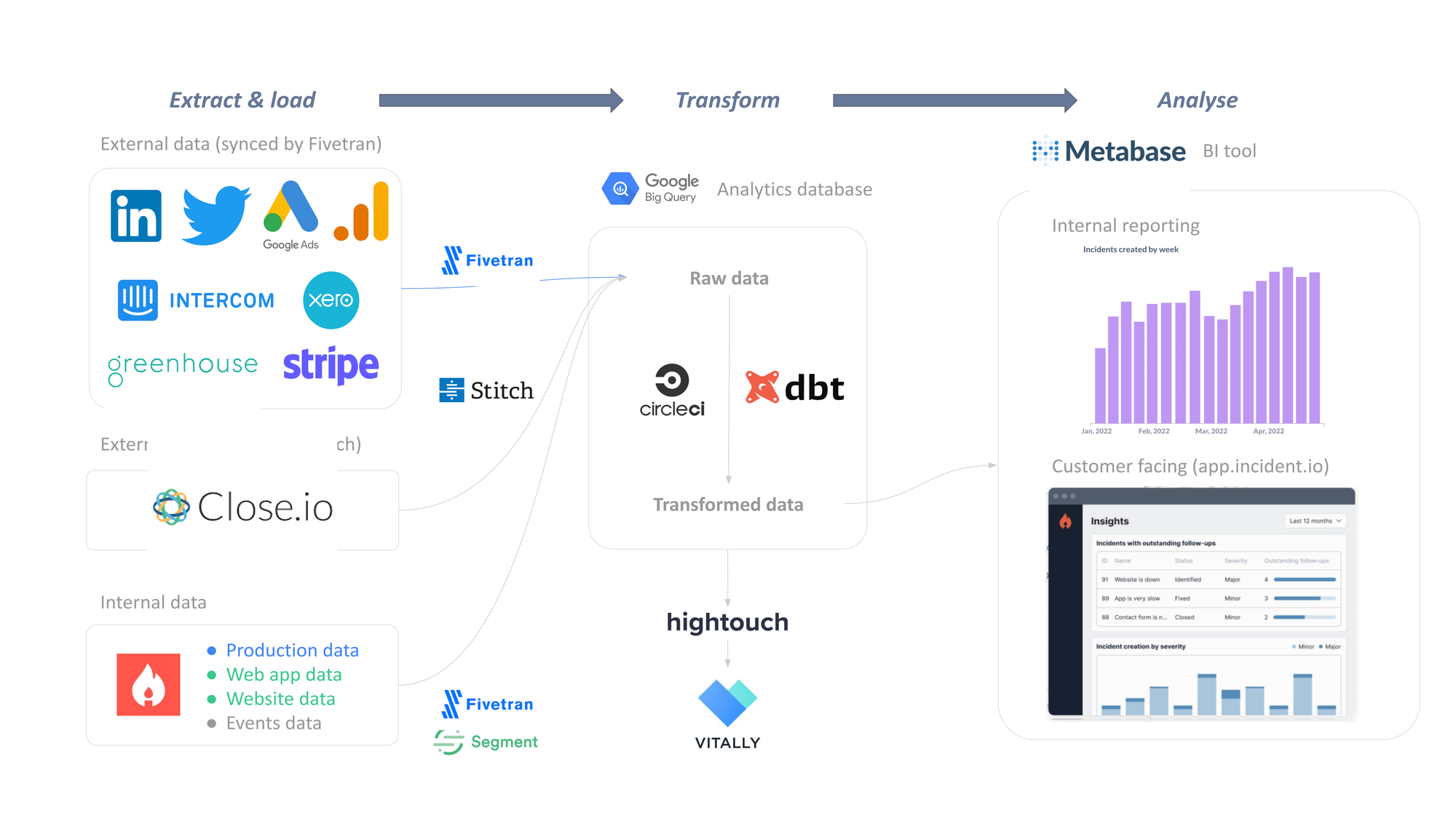 It’s been over 6 months since Lawrence’s excellent blog post on our data stack here at incident.io, and we thought it was about time for an update. This post runs through the tweaks we’ve made to our setup over the past 2 months and challenges we’ve found as we’ve scaled from a company of 10 people to 30, now with a 2 person data team (soon to be 3 - we’re hiring)!