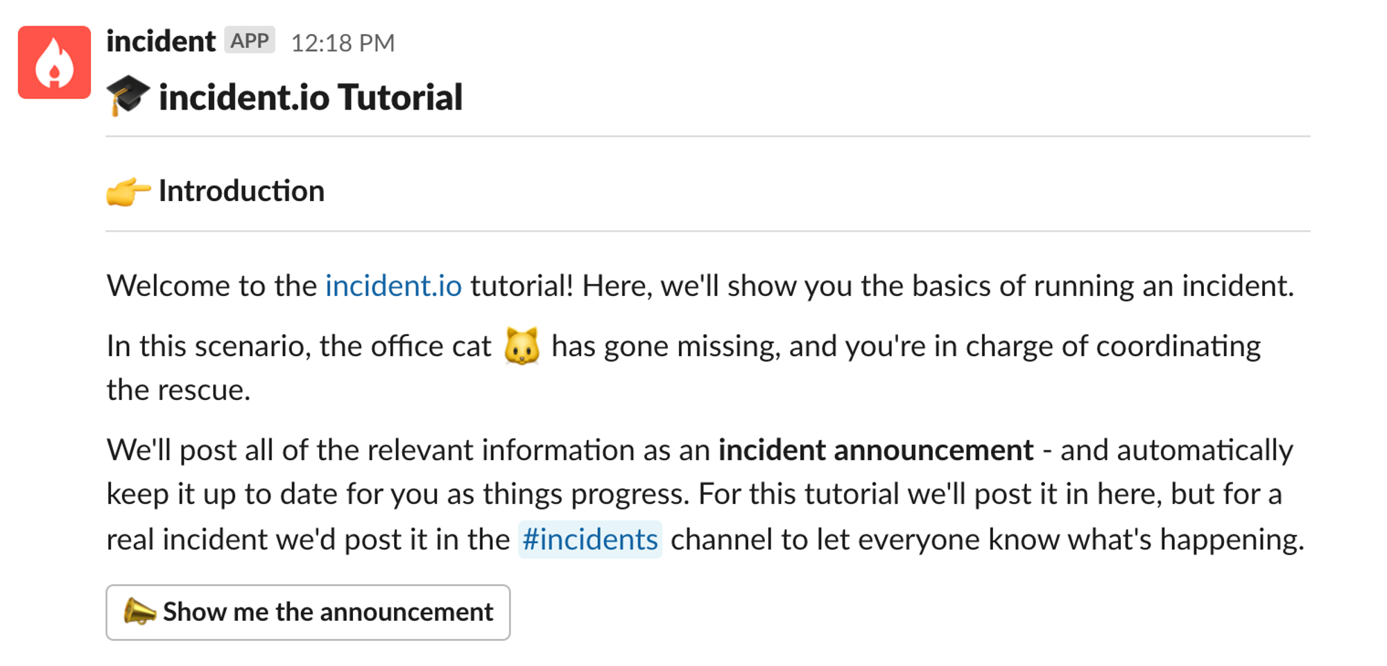 In the incident.io interactive tutorial flow, we guide the user through a simulated incident where a cat is stuck up a tree. We keep it light and engaging, and explain each step clearly.