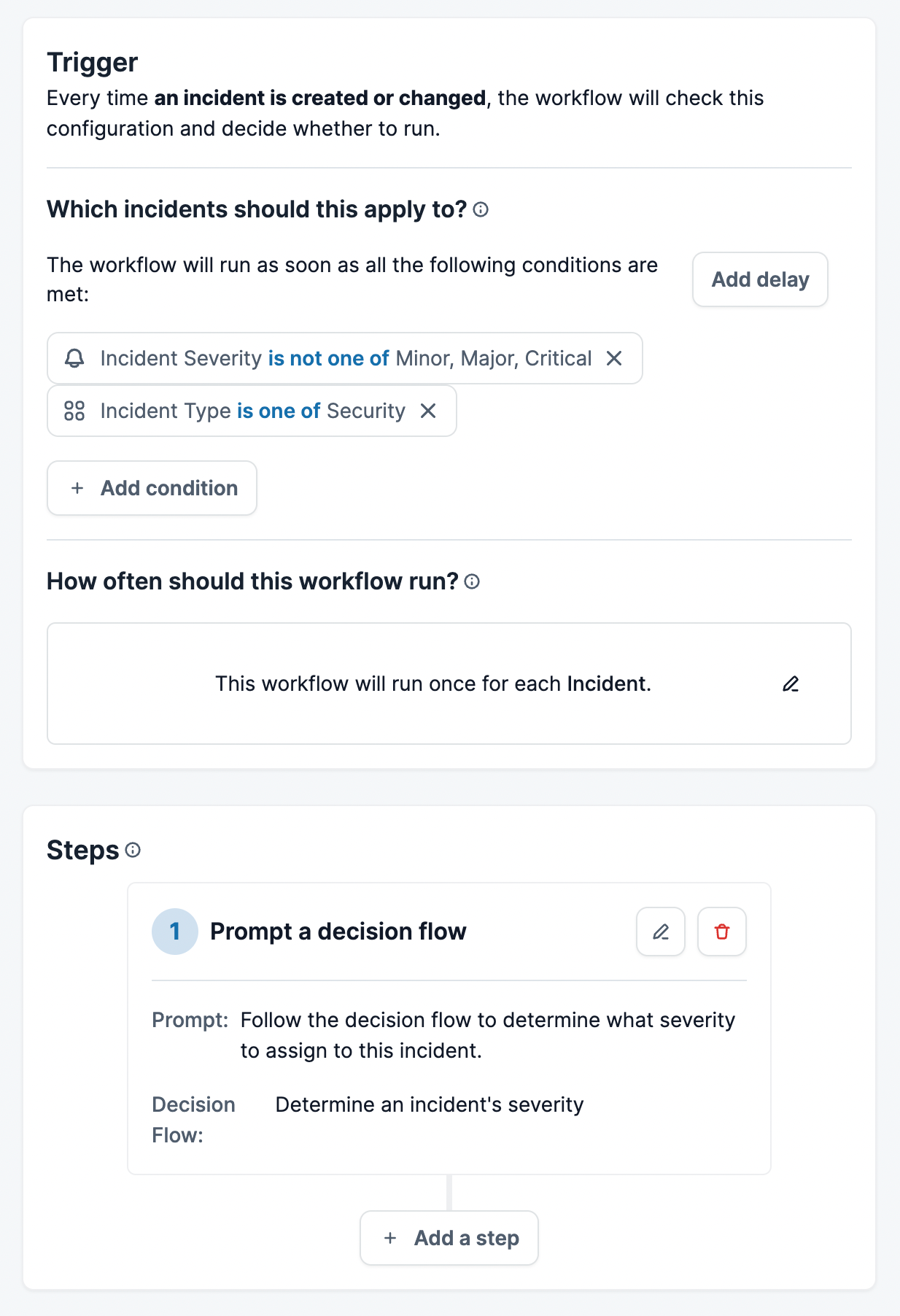 You can also start a decision flow automatically using the Workflows feature. This gives you the flexibility to trigger different decision flows for different flavours of incidents.