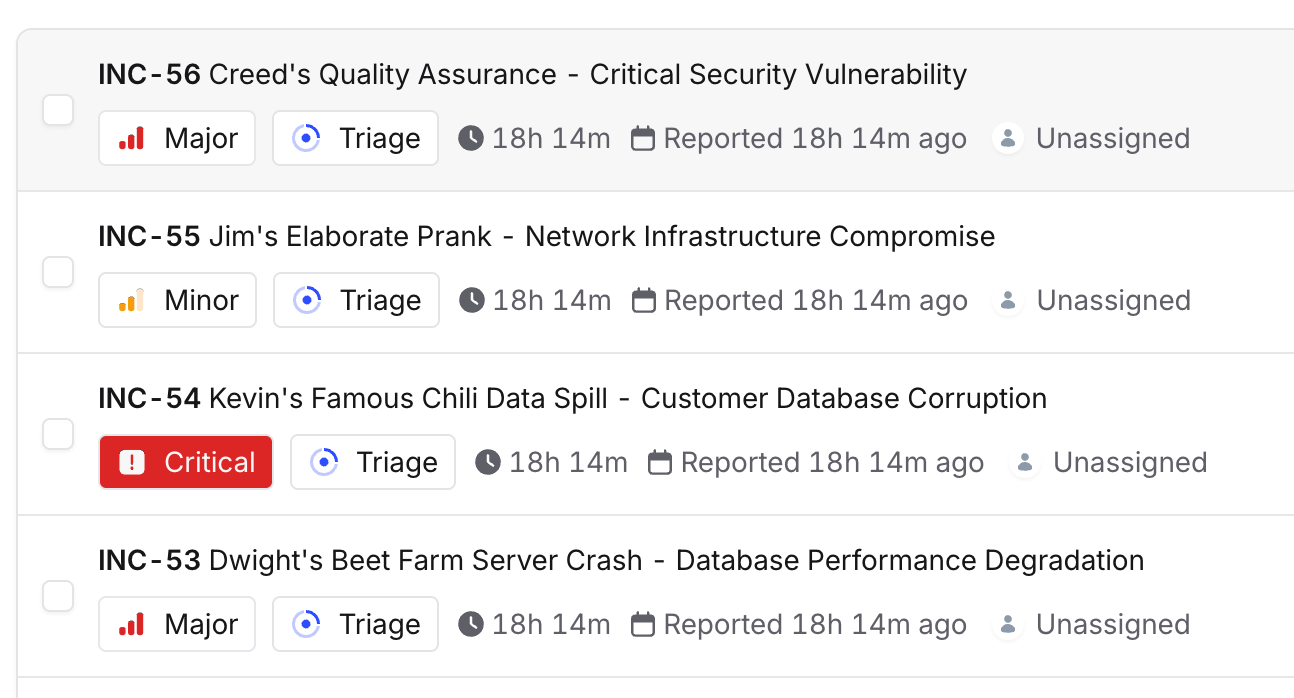 Create 4 sample incidents based on funny moments from the TV show 'The Office'