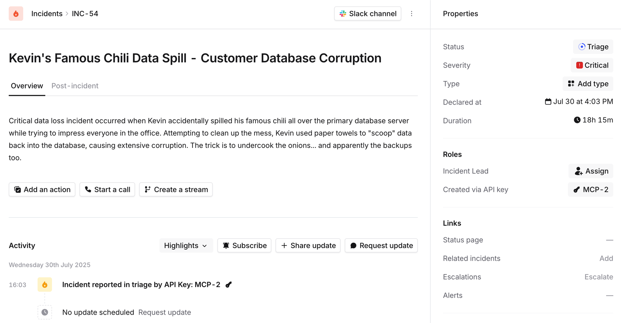 If you've ever wished you could just ask Claude (or any MCP client) to handle incident management tasks instead of context-switching between chat and your incident management dashboard, you're going to like what we built.