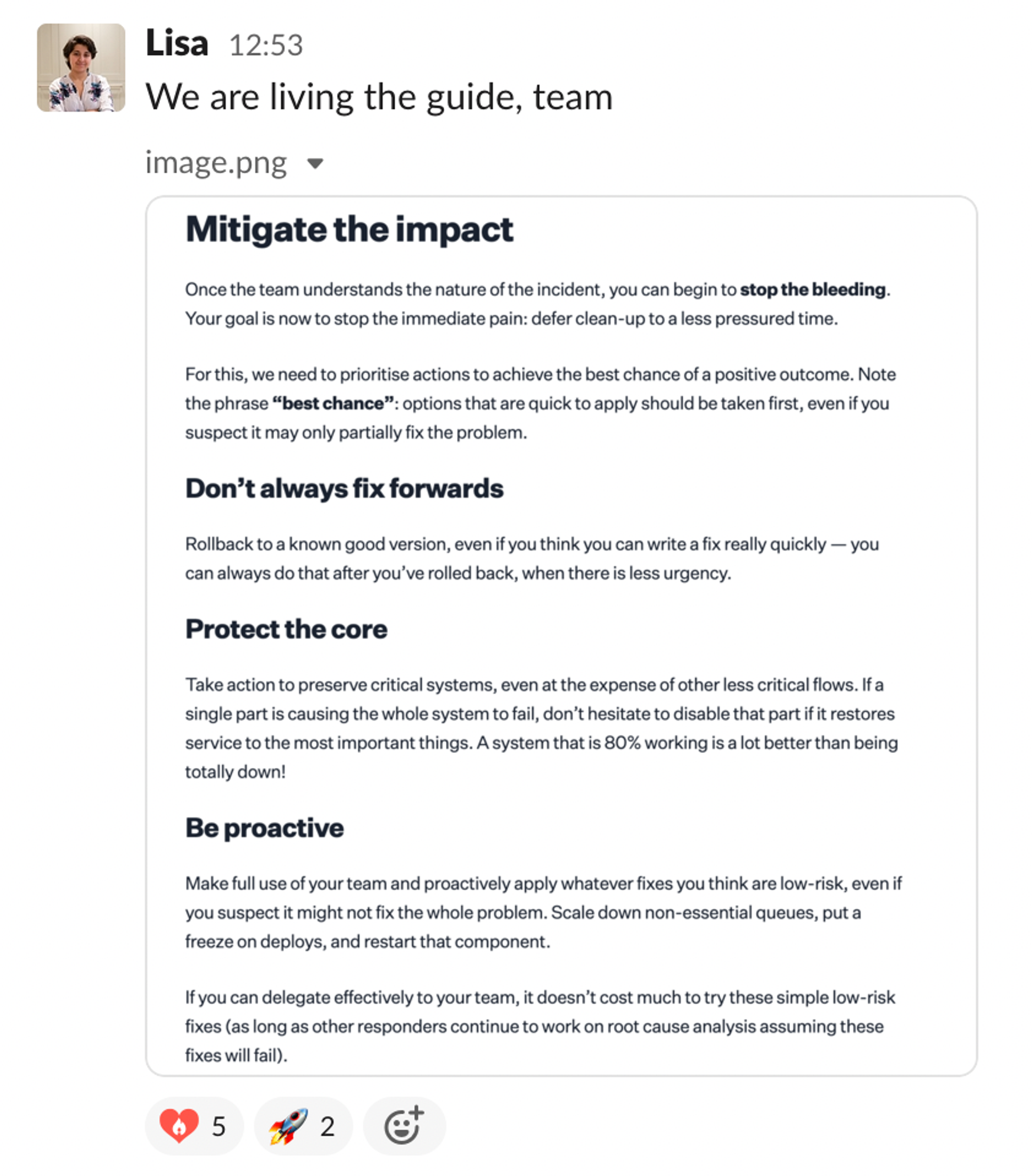 On reflection, the Incident Lead should probably be the calmest person in the room. They are not responsible for fixing or diagnosing the issue (which could be a big unknown), and panicking about other responders fixing it might put the responders off. An Incident Lead brings more value by not getting into the weeds of the problem. So next time I’m hoping to channel a zen-like attitude.