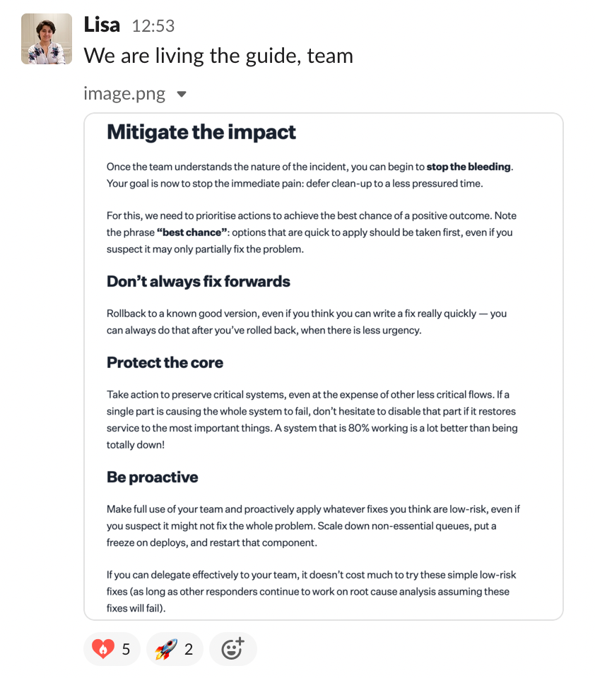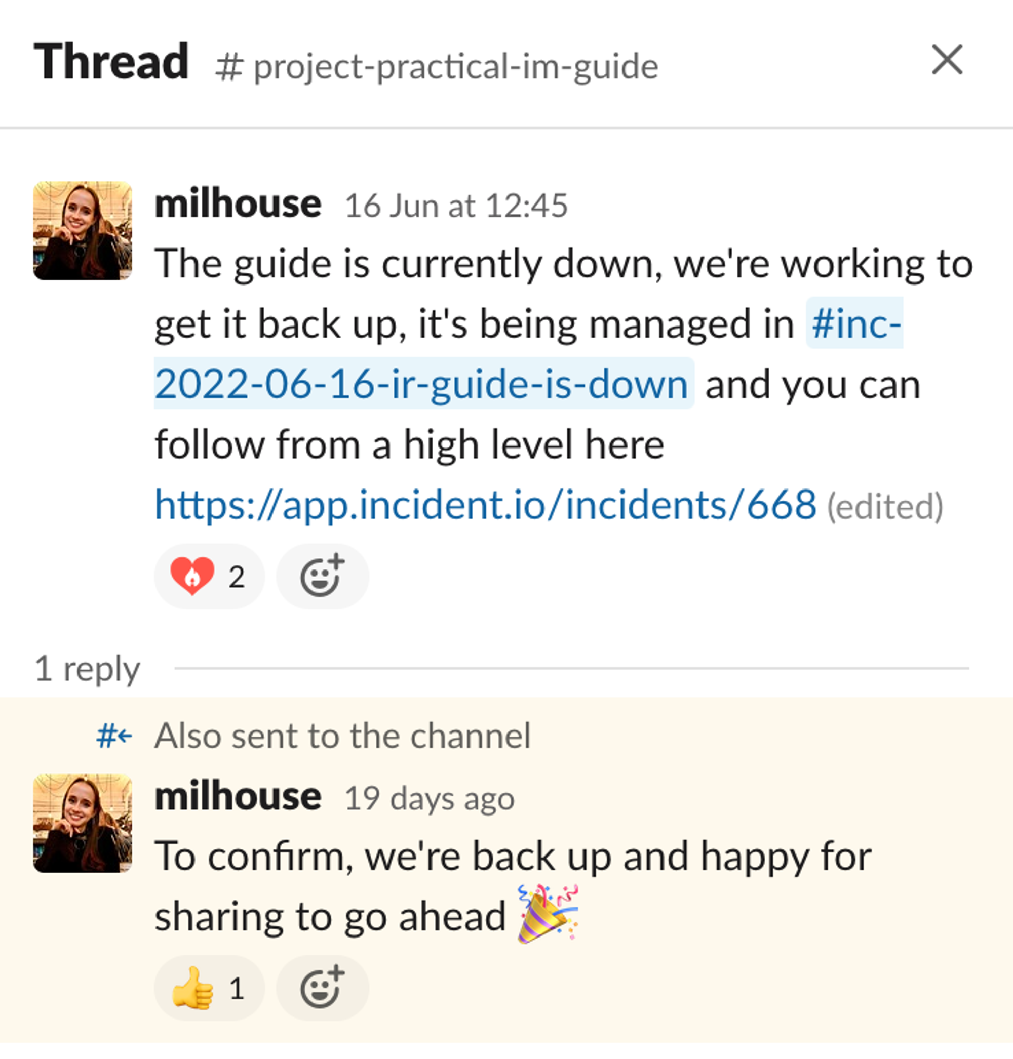 The funny thing is, my day job revolves around incidents, and I’ve built parts of the incident.io product myself, yet I couldn’t work out what I was meant to be doing with the tools in front of me. Luckily I had an experienced firefighter giving me pointers, we steered the team and within 30 minutes the guide was up again.