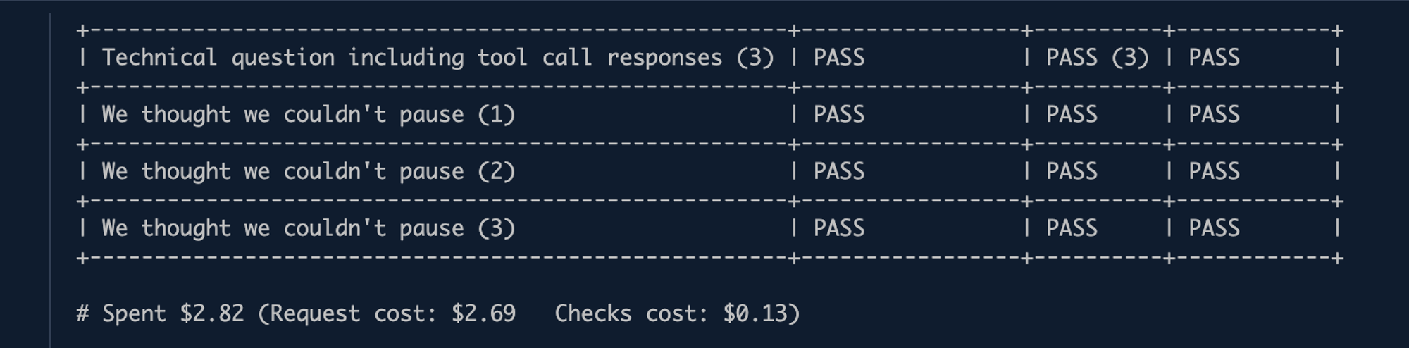 Finally, before we even hit production, our eval suite, the “tests” of the LLM prompting world, report the exact cost of their run. Knowing exactly how much we’re spending when we run our CI let’s us run it every time we make a change, directly impacting the reliability of our product and the speed at which we iterate.