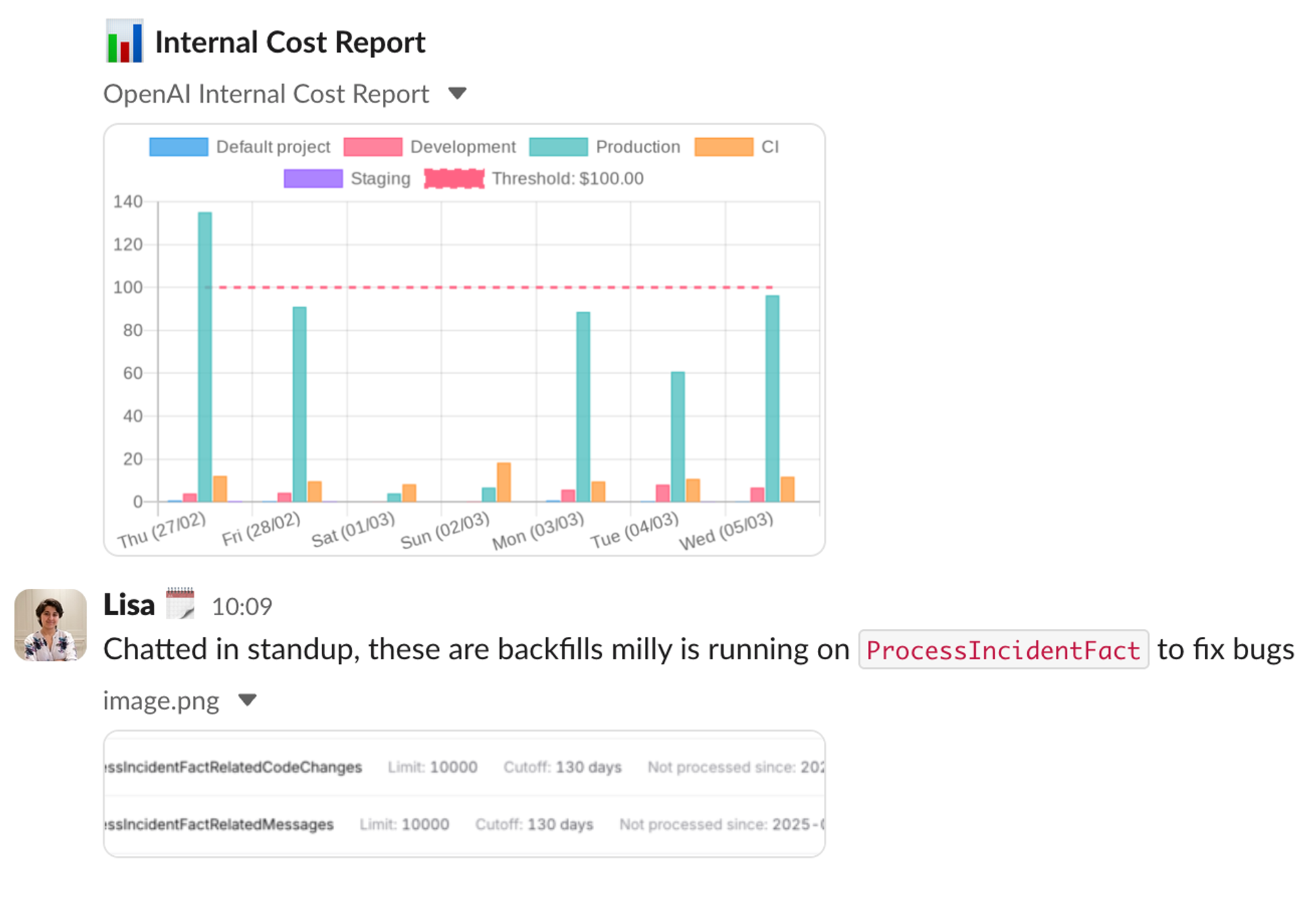 For us, that means that every working morning we receive a screenshot in a Slack channel (#ai-cost-pulse) breaking down the previous 7 days of spend across different environments. We also have a similar one for our projects, so we can attribute spend to individual features.