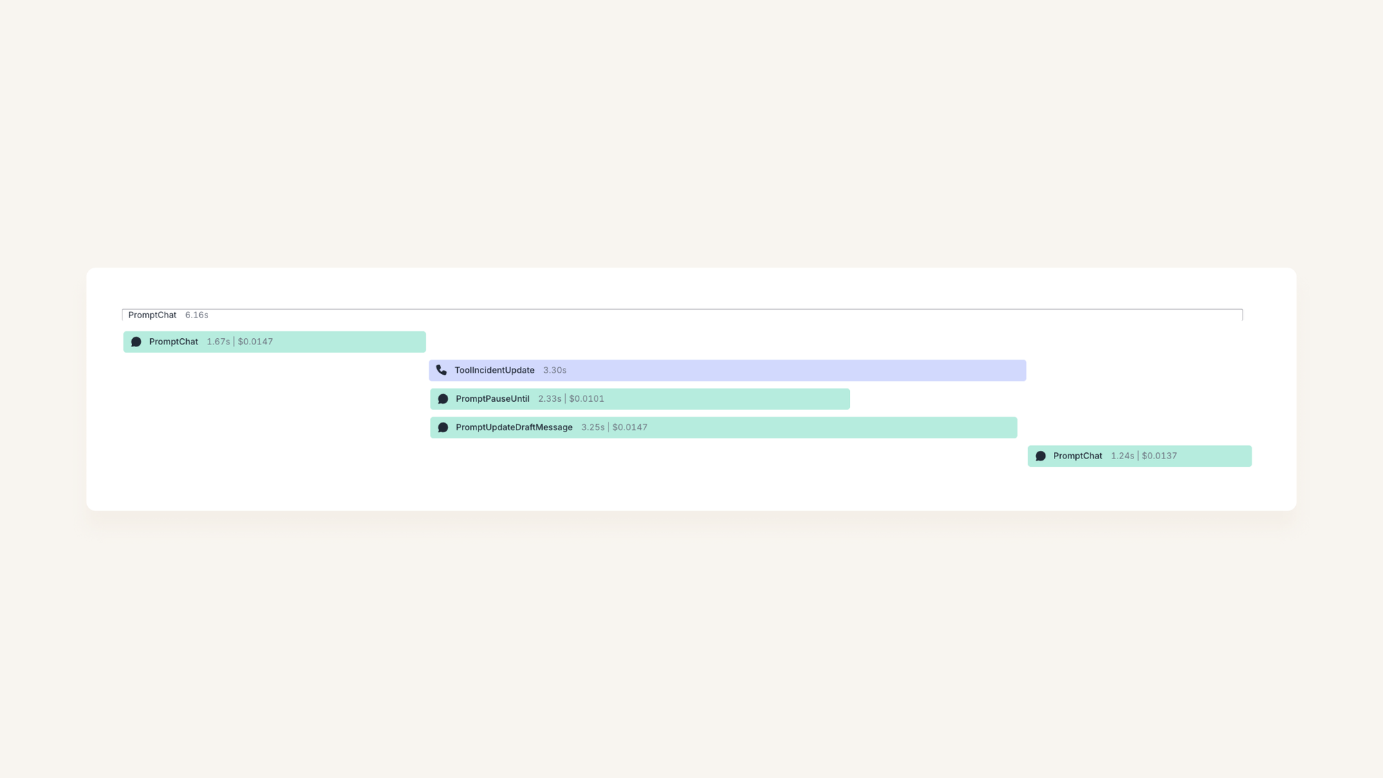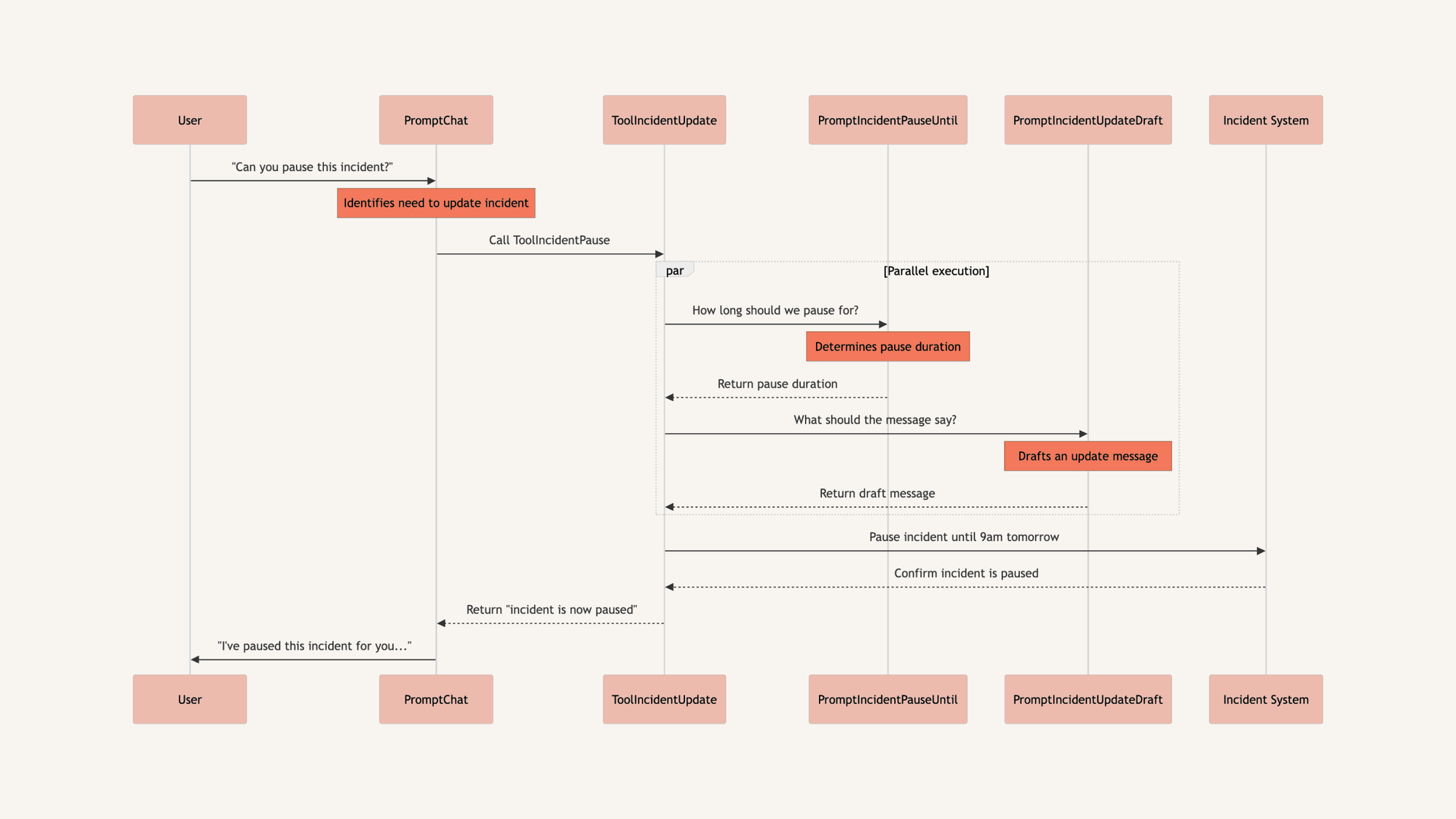 PromptChat , which identifies that it needs to make a change to the incident so it calls a tool ToolIncidentUpdate .PromptIncidentPauseUntil, which figures out how long we should pause the incident. In parallel, it also calls a prompt PromptIncidentUpdateDraft which writes a message that should accompany the update, so that our key stakeholders understand why we’ve paused the incident (in this case, it’s so the team can get some sleep!)PromptChat to say that we’ve actioned the request: the incident is now pausedPromptChat then drafts our message back to the user (I’ve paused this incident for you…).Or if you’re a fan of sequence diagrams, we can express it like this: