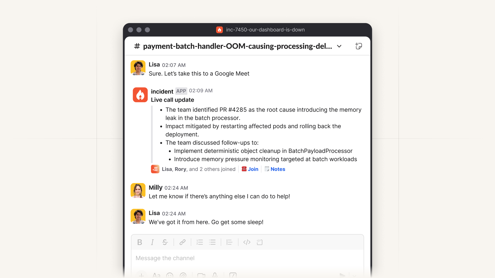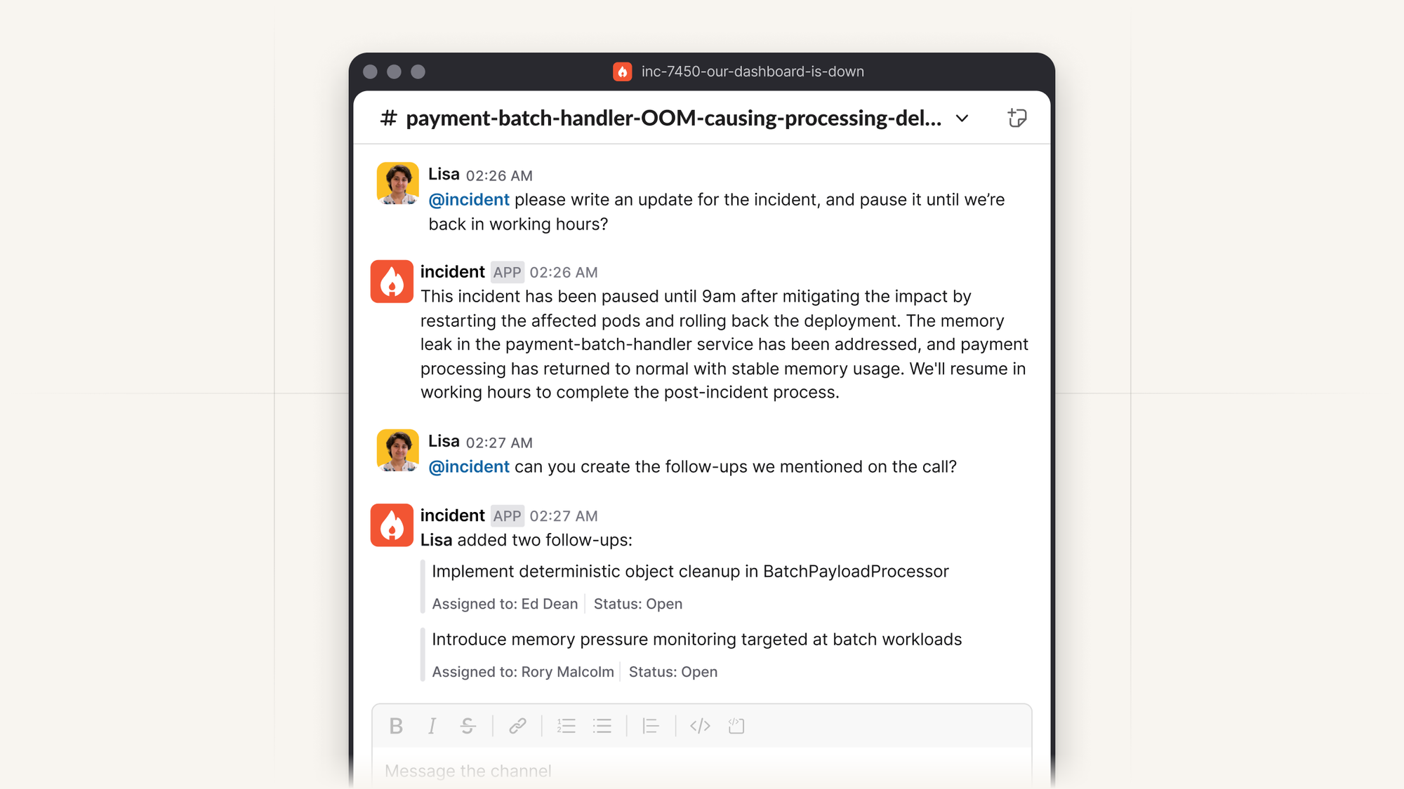 We started with Scribe and features like suggested summaries and follow-ups. These reduce the operational overhead of incident response from configuring alerts to finishing follow-ups so you can focus on actually fixing the issue. Scribe, for example, writes notes for you in real-time during incidents and shares them in your incident channel just like somebody tasked with taking notes on the call would, so no valuable context is lost.