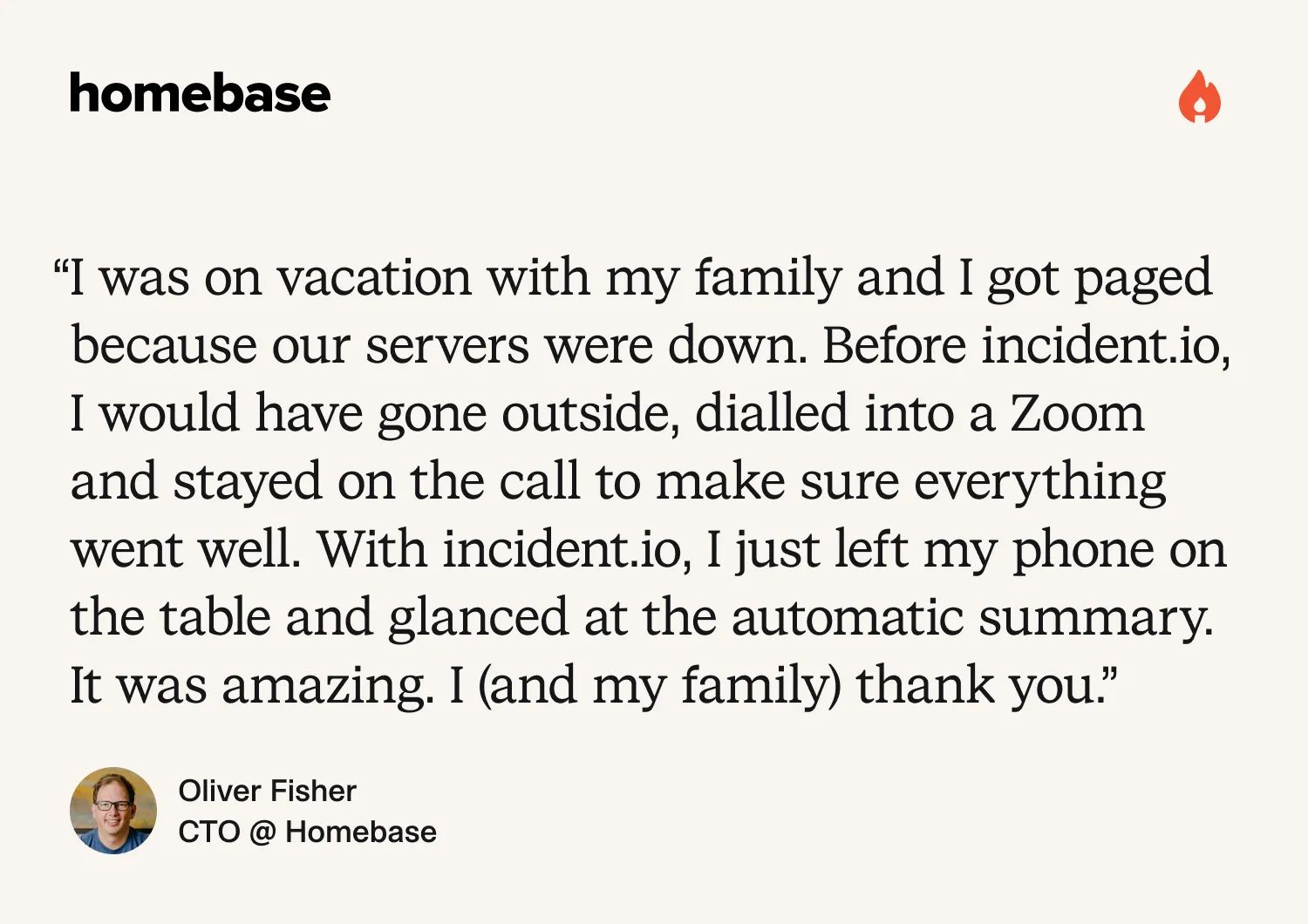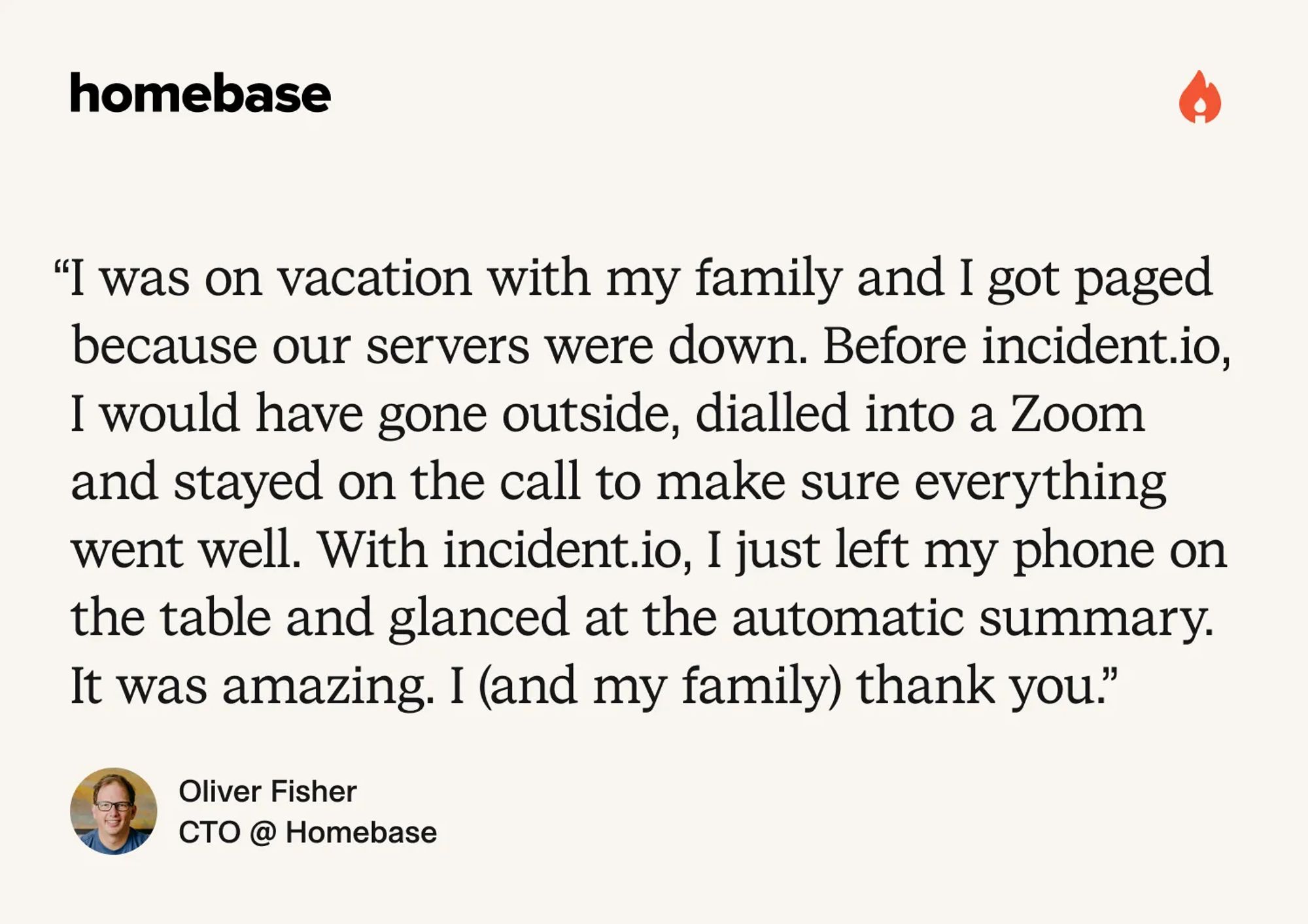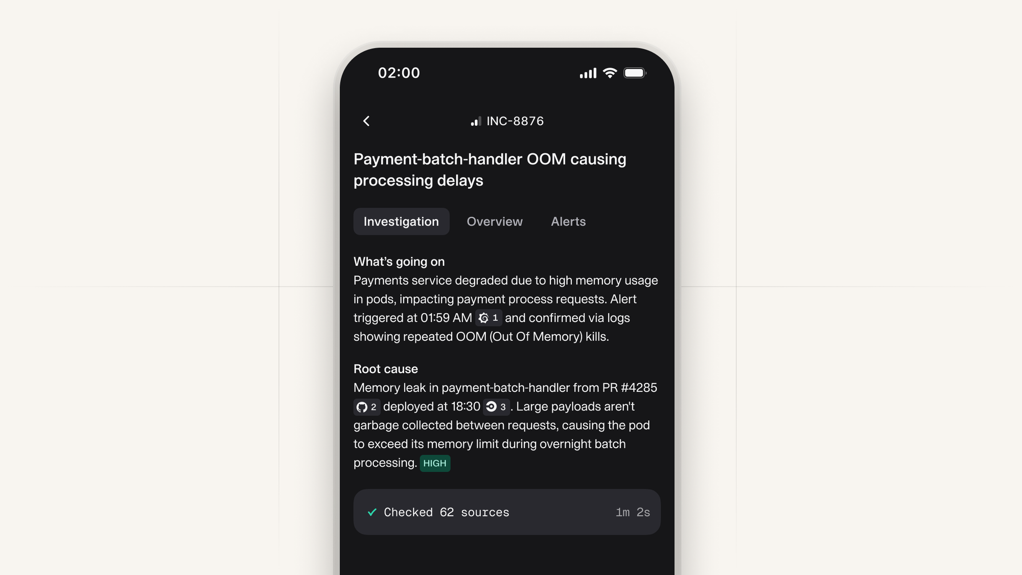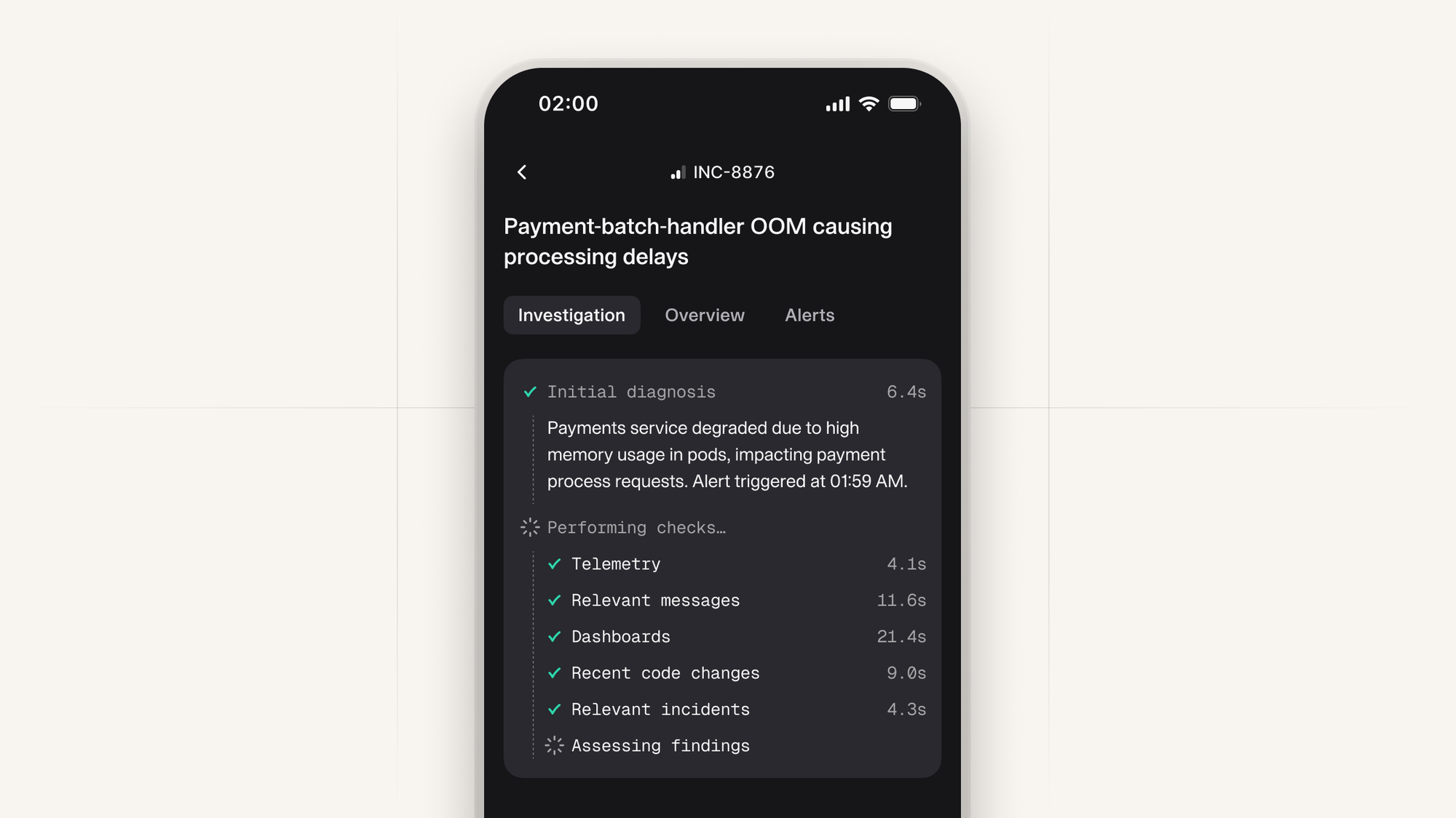 Your phone buzzes with that dreaded on-call alert at 2 AM. Your heart sinks as you reluctantly reach for it, hoping it's just a false alarm. Instead of opening your laptop to fumble through a dozen tabs of 2 am 2FA, you open the incident.io app to find an investigation already underway.