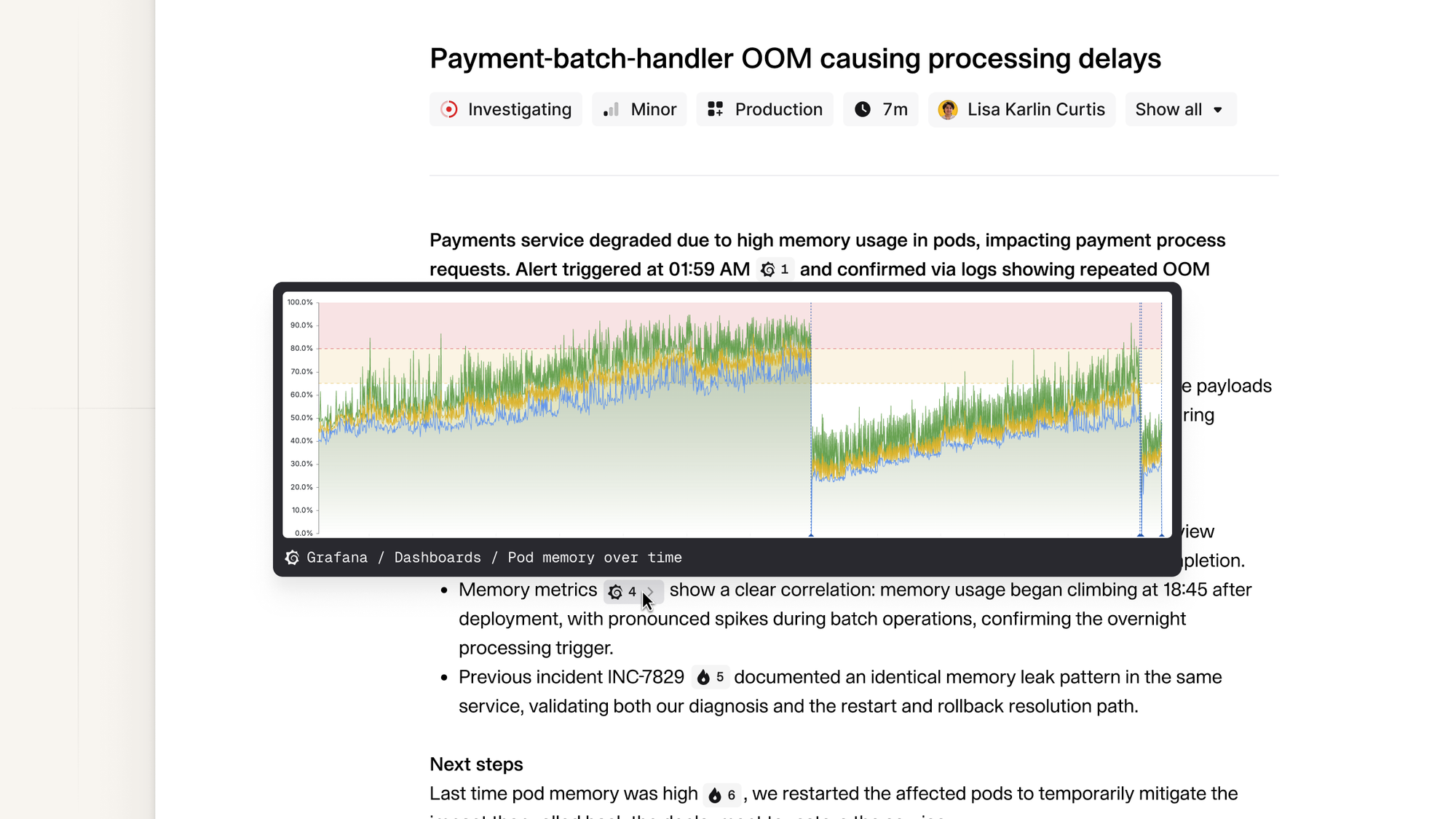 The situation looks serious - the payment-batch-handler is experiencing OOM errors, and customer payments aren't processing. You splash some cold water on your face and get your laptop out to respond, where you find a root cause with memory usage graphs and the specific PR that caused the incident. Next steps are laid out too based on how your team has responded to similar incidents before. You ask a couple of targeted questions: "Have we made other changes to garbage collection recently?" and "Have we seen similar issues before?". Within seconds, incident.io provides concise, relevant answers.