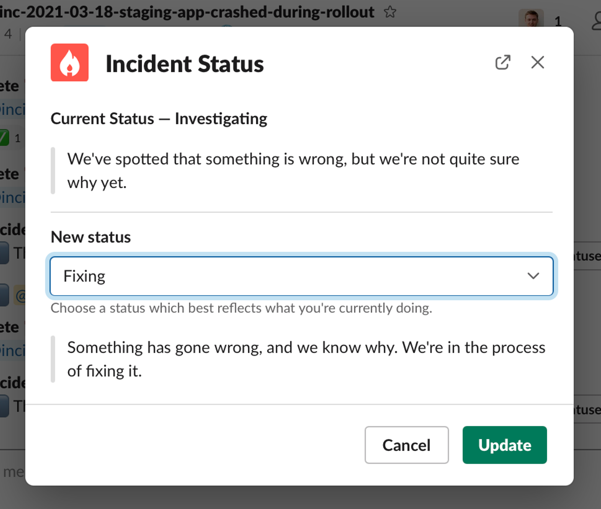 These states can be controlled via Slack, and the timestamps can be updated via the dashboard after the incident if any adjustments are needed later.