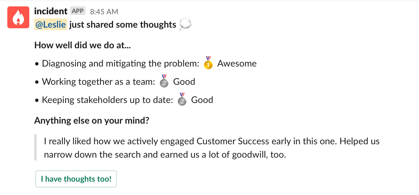 We'll automatically check in at the end of an incident and ask everyone how it went, with a few specific questions, as well as some more general prompts.