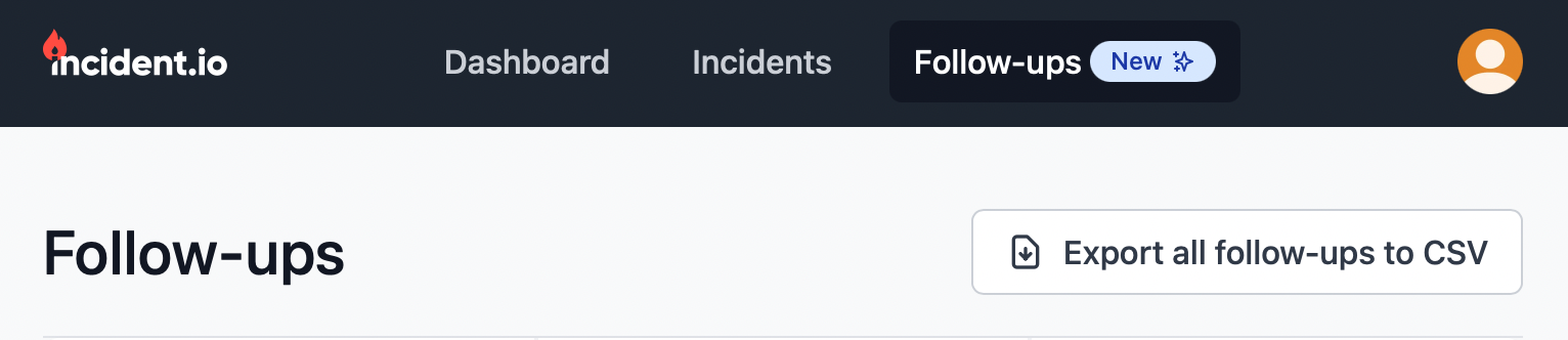 From the follow ups page you can export a CSV of all the follow up actions across your organization. This will include information about the action (description, reporter, assignee) and the external issue tracker reference if you're using one. There's also information about the incident on each row to help you sort, filter, report and apply your spreadsheet wizardry!