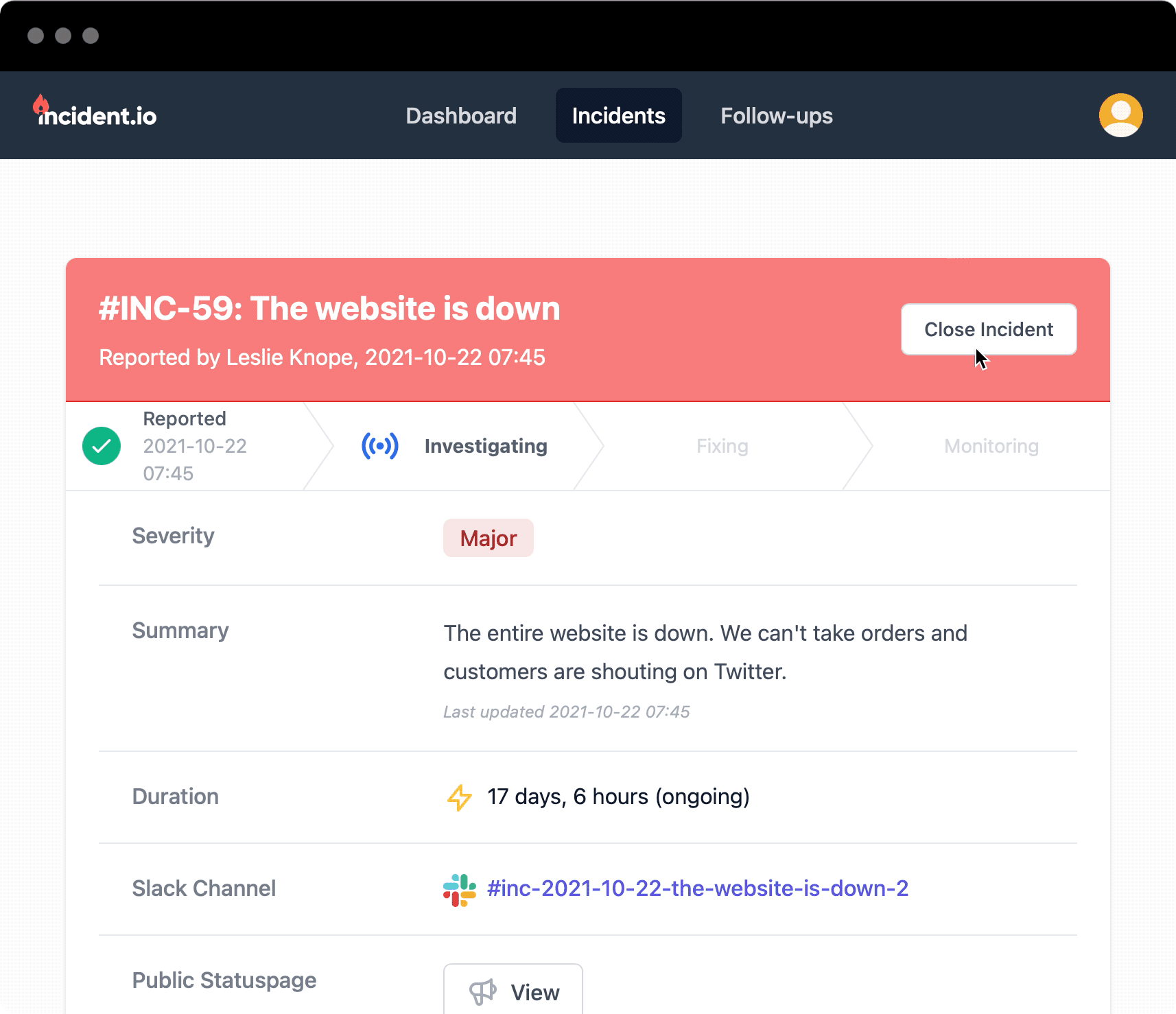 You can now close incidents from the dashboard (instead of having to be in the relevant incident channel). This is particularly useful when tidying up old incidents ready for analysis. It also continues to bridge the gap between what's possible from inside Slack vs. the dashboard.