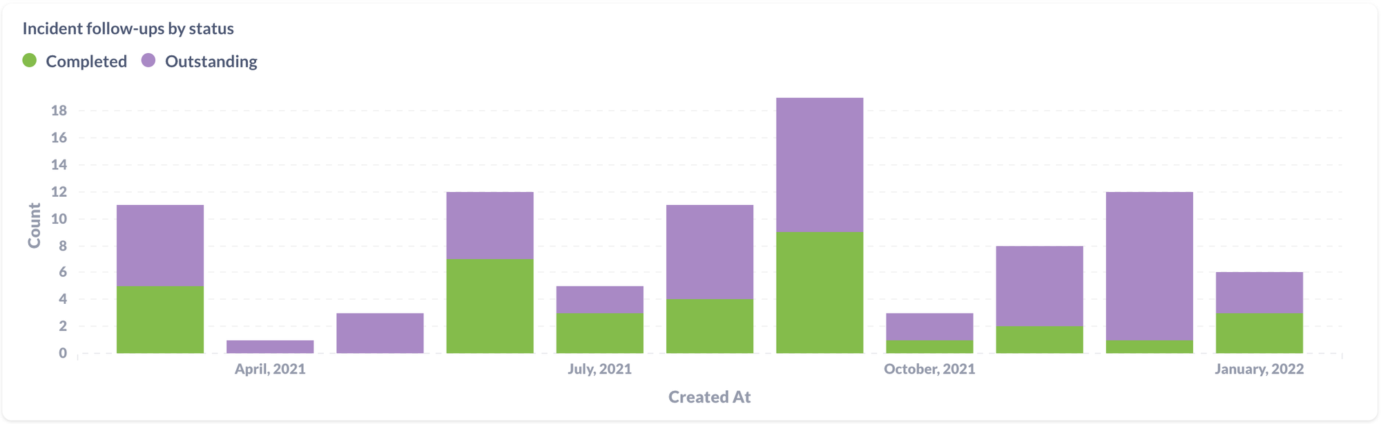 As the old saying goes, "fool me once, shame on you, fool me twice, shame on me." Taking the steps to learn from every incident and prevent the same issue coming back again is crucial. Here, you can see the completion rate of follow-up actions over time, and break them down by severity. You can also see how many incidents are having a post-mortem written.